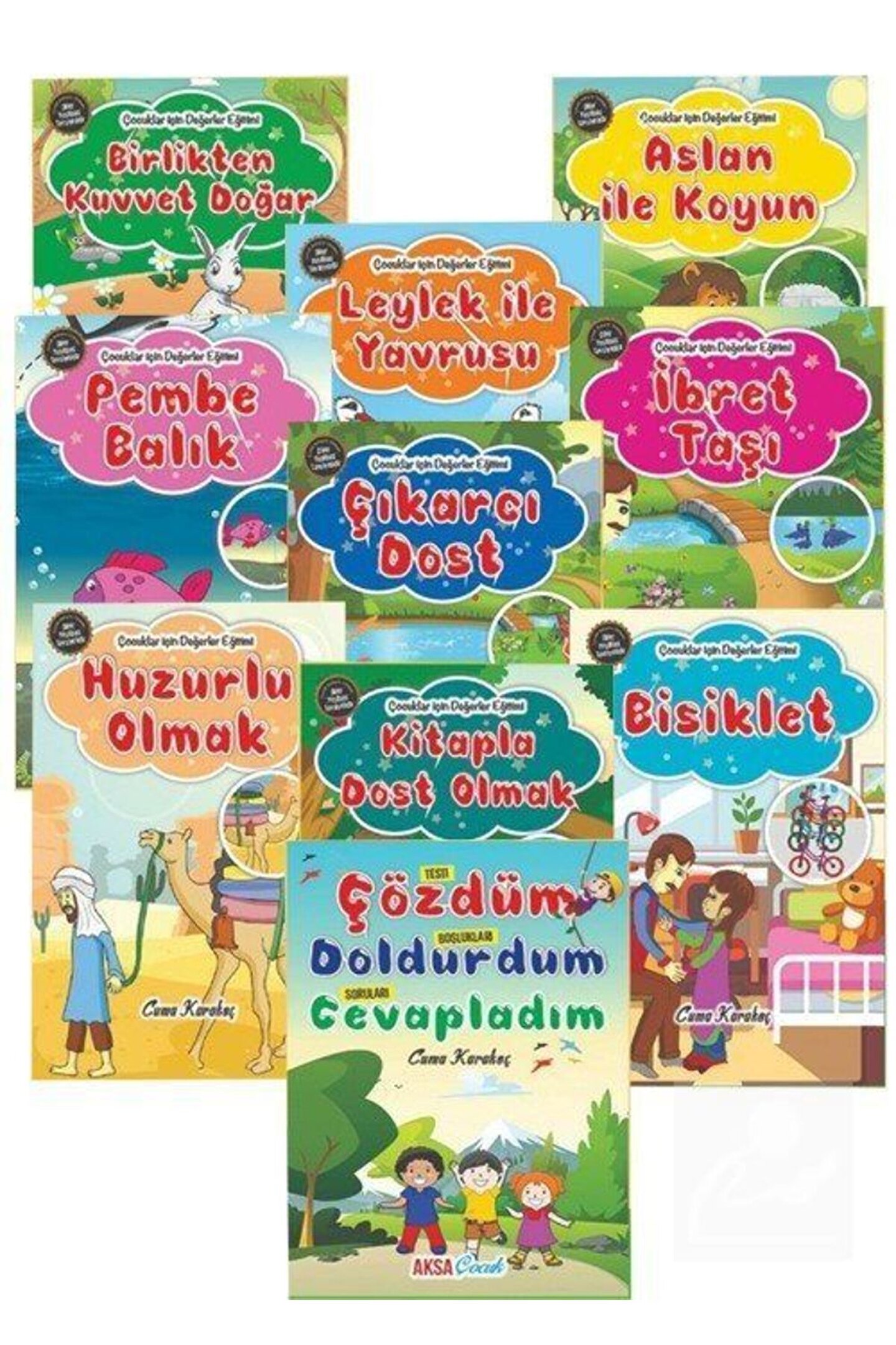 Çocuklar İçin Hikayelerle Değerler Eğitimi (10 Kitap Takım) Cuma Karakoç / Aksa Çocuk Basım Yılı: 2020; Sayfa Sayısı: 160; Kağıt Türü: Kuşe Kağıt; Ebat: 14,8 x 21; Dil: Türkçe; Cilt Durumu: Karton Kapak; ISBN: 9786056614842; Yazar: Cuma Karakoç; BİRLİKTEN KUVVET DOĞAR Evvel zaman içinde kalbur saman içinde etrafı koca dağlarla çevrili olan çok sevimli bir yer varmış.; Burada her türlü havuç çeşidi yetişiyormuş.; Havuçların olduğu yerde kalabalık bir tavşan topluluğu yaşıyormuş.; LEYLEK İLE YAVRUSU Zamanın birinde kanat uçları siyah vücudunun geri kalan kısmı ise beyaz olan bir leylek yaşarmış.; Bu leyleğin birbirinden güzel dört sevimli yavrusu olmuş.; Leylek yavrularını çok seviyormuş.; ASLAN İLE KOYUN Zamanın birinde her tarafı yemyeşil ormanlarla çevrili olan bir yer varmış.; Bu yerde; tilkiler kuşlar kurbağalar cırcır böcekleri koyunlar tavşanlar ve adını sayamadığımız nice hayvanlar yaşarmış.; Bu ormanın kralı PEMBE BALIK Masmavi denizin ortasında pembe bir balık yaşıyordu.; Pembe balığın keyfi ne diyecek yoktu.; Suyun derinliklerinde hem karnı doyuyor hem de gülüp eğleniyordu.; Bu koca denizde gitmediği tek bir yer vardı.; ÇIKARCI DOST Zamanın birinde sinsi bir tilki yaşıyormuş.; Bu tilki zamanla yaşlanmış.; Yaşlanınca gözleri eskisi gibi göremez olmuş.; Böyle olunca da av bulmakta zorluk çekmeye başlamış.; Sinsi tilki bu duruma bir çözüm bulmak için İBRET TAŞI Bir zamanlar Salih adına küçük bir çocuk yaşarmış.; Salih çok sevimli bir o kadar da şirinmiş.; Sevimli olduğu için her kes onu çok seviyormuş.; Bu sevgi zamanla Salih'i çok şımartmış.; HUZURLU OLMAK Zamanın birinde zengin bir tüccar yaşıyordu.; Bir gün bu tüccar ticaret yapmak için uzak ülkelerden birine gitmeye karar vermiş.; Tüccar yola çıkmadan önce kendisi için gerekli olan yiyecek ve içeceği KİTAPLA DOST OLMAK Dedem yaz aylarında bizim evde kalırdı.; O gündüzleri tarla işleriyle uğraşır geceleri ise bizi etrafında toplar hikâyeler anlatırdı.; Dedem hikâye anlatmaya başladığı zaman bütün dikkatimizi ona verir BİSİKLET Koca şehrin üzerine derin bir sessizlik çökmüştü.; Her yer boş ve sessizdi.; Hava o kadar çok soğumuştu ki sokak lambalarının etrafına üşüşen kelebekler artık yoktu.; Sessiz karanlığın içinde uyuyanlar ÇÖZDÜM-DOLDURDUM-CEVAPLADIM ASLAN İLE KOYUN SORU-1: Hikâyede hangi hayvan geçmiyor? a) Tilki b) Kuş c) Koyun d) Keklik ASLAN İLE KOYUN SORU-1: Aslanın astığı .; kestiği kestik imiş.; NE ANLADIK? SORU-1: Koyun nasıl biridir?