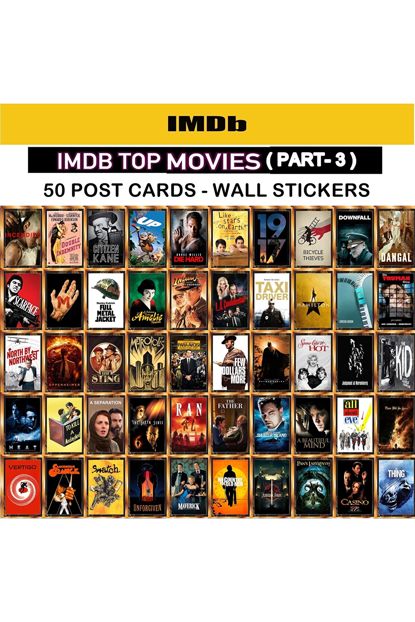 IMDB TOP 50 ( 50 FİLM - POSTCARD - WALL STICKER ) Ürün boyutu ( 10 x 15 cm olup 50 Adetdir ).; ULTRA HD Çözünürlüklüdür.1. SINIF PVC FOLYODAN '' Üretilmiş olup DIŞ MEKAN BASKIDIR.; Kağıt ürünler gibi RENKLERDE SOLMA RENK DEĞİŞTİRME KESİNLİKLE OLMAZ.; Su ve temizlik malzemesinden hasar görmez.; KENDİNDEN YAPIŞKANLI Olup söküldüğünde iz yapmaz.; Tüm düz zeminlerde kullanabilirsiniz.; Duvar posterleri oda dekorasyonunun sevilen ve zarif bir yoludur.; Oturma odası, yatak odası,koridor, yatak odası ve yemek odası için estetik olarak iyi bir seçimdir.; Sanatsal güzellik getirir.; Yüksek kaliteli posterler: AKTÜEL POSTER kalitesi ile evinizi renkli, güzel ve göz alıcı hale getiren parlak ve canlı renkler.; TÜM POSTERLER FİRMAMIZ TARAFINDAN DİZAYN EDİLMİŞTİR.