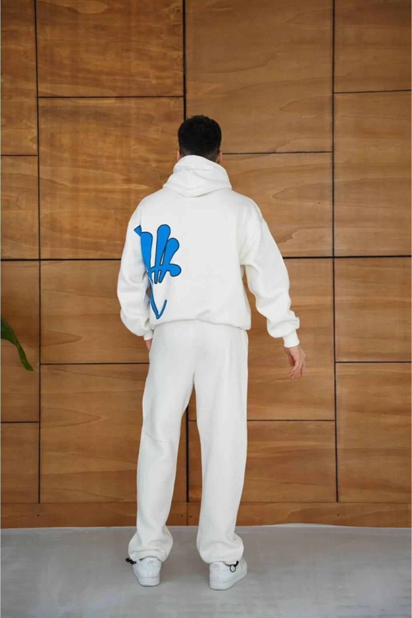 Erkek Kapüşonlu Eşofman Takım Graffiti BaskılıOversize Rahat Kalıp, Kanguru Cepli, Streetwear Tarzında Premium Ürün 3 Iplik Pamuklu - Beyaz