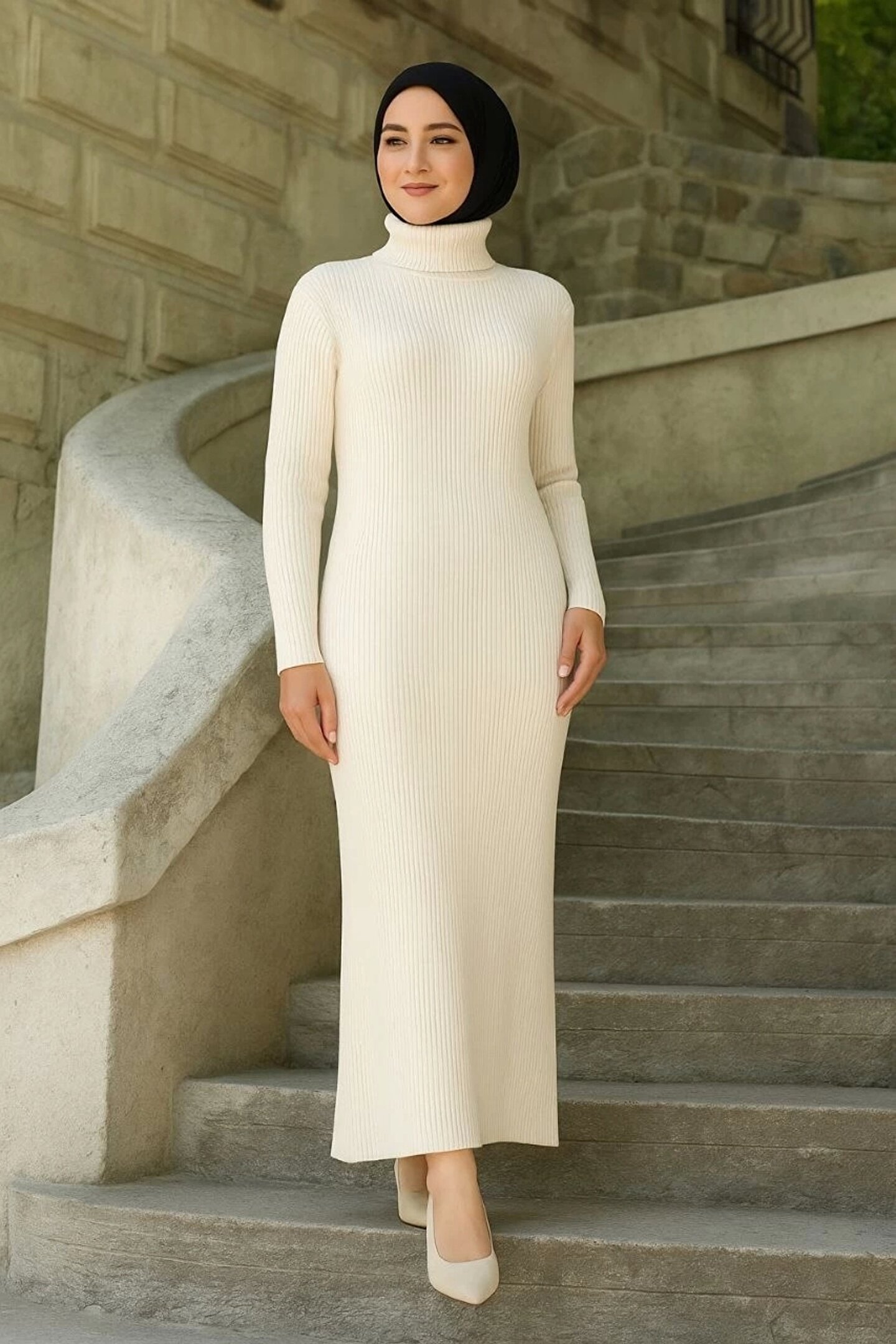 - Beyaz renk seçeneğiyle şıklığı ve sadeliği bir arada sunar.; - Slim kalıbı sayesinde vücut hatlarınıza uyum sağlar ve zarif bir siluet oluşturur.; - Mono kapama detayı ile kolay kullanım ve pratik bir giyim deneyimi sunar.; - Dokuma kumaş tipi, dayanıklılığı ve konforu bir arada garanti eder.; - Tesettür giyim koleksiyonuna uygun tasarımıyla modern ve şık bir görünüm sağlar.; - Düz deseniyle zamansız bir stil sunarken, beyaz rengiyle her ortamda dikkat çeker.; - Uzun boyu sayesinde hem günlük kullanım hem de özel günlerde rahatlıkla tercih edilebilir.; - Cepsiz tasarımı minimalist görünümü desteklerken, aplike detayları ile farklılık yaratır.; - Cool & Comfort persona'sını yansıtan bu elbise, rahatlığı ve trend görünümü birleştirir.; - Sürdürülebilirlik detayına sahip olması çevre dostu bir tercih yapmanızı sağlar.; - Akrilik materyal bileşeni soğuk havalarda sıcak tutarken yumuşak dokusuyla konfor sunar.; - Yıkama talimatlarına uygun bakım yapıldığında uzun ömürlü kullanım vaad eder.; - Kutu içermemesi,