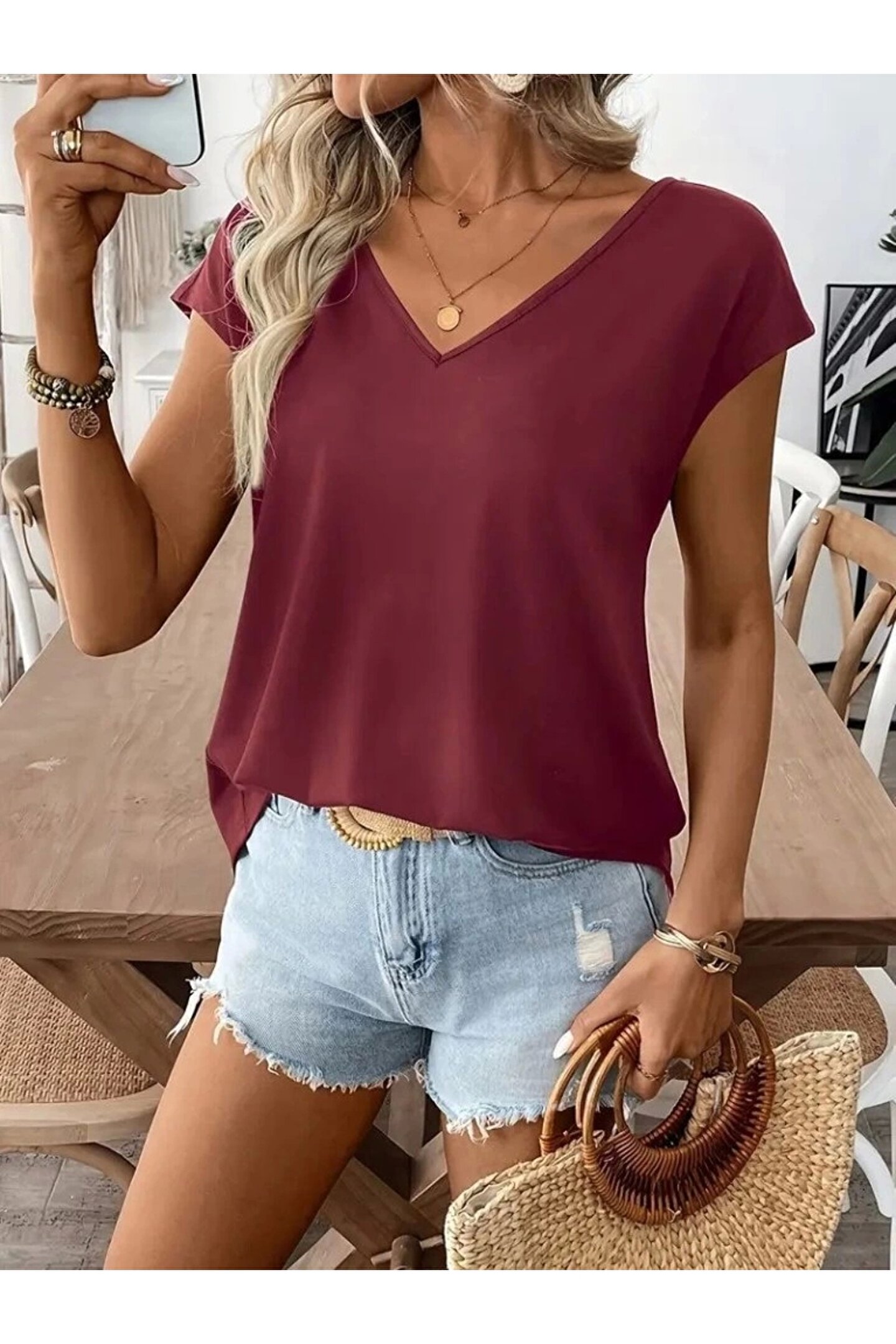 Kadın Kısa Kollu V Yakalı Arkadan Kurdele Detaylı Viskon Bluz