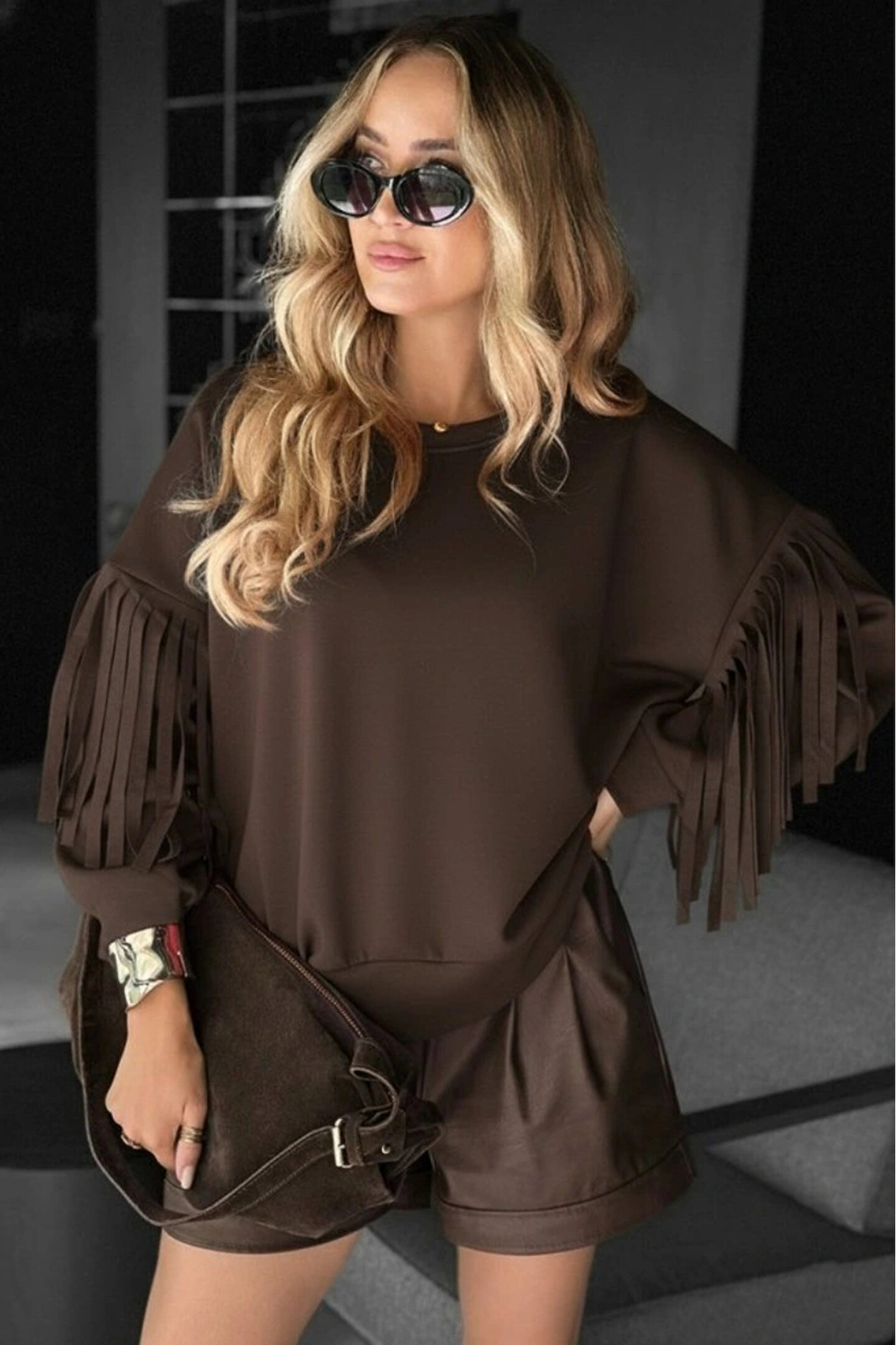 Kadın Uzun Kollu Bisiklet Yaka Kolları Püsküllü Modal Bluz