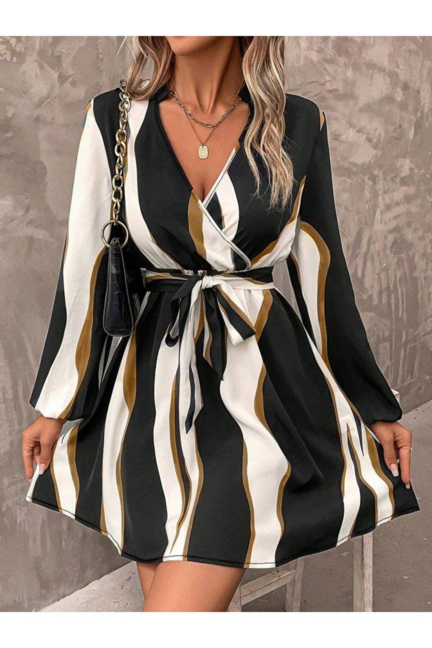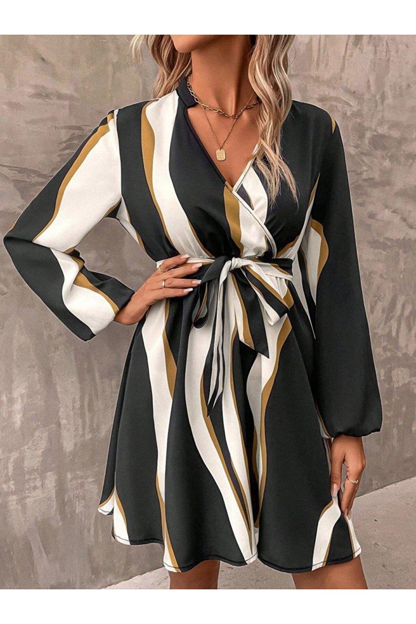ALPACO Kadın Uzun Kollu Kruvaze Yakalı Desenli Modal Mini Elbise
