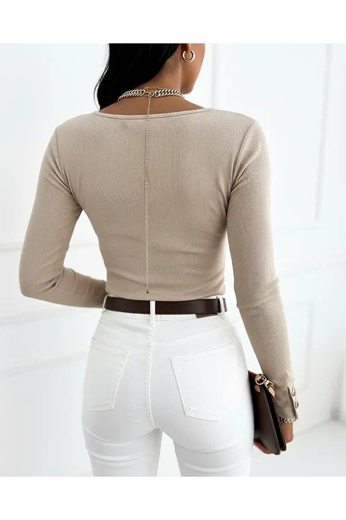 Kadın Uzun Kollu Yakadan Açık Ve Düğme Detaylı Kaşkorse Bluz