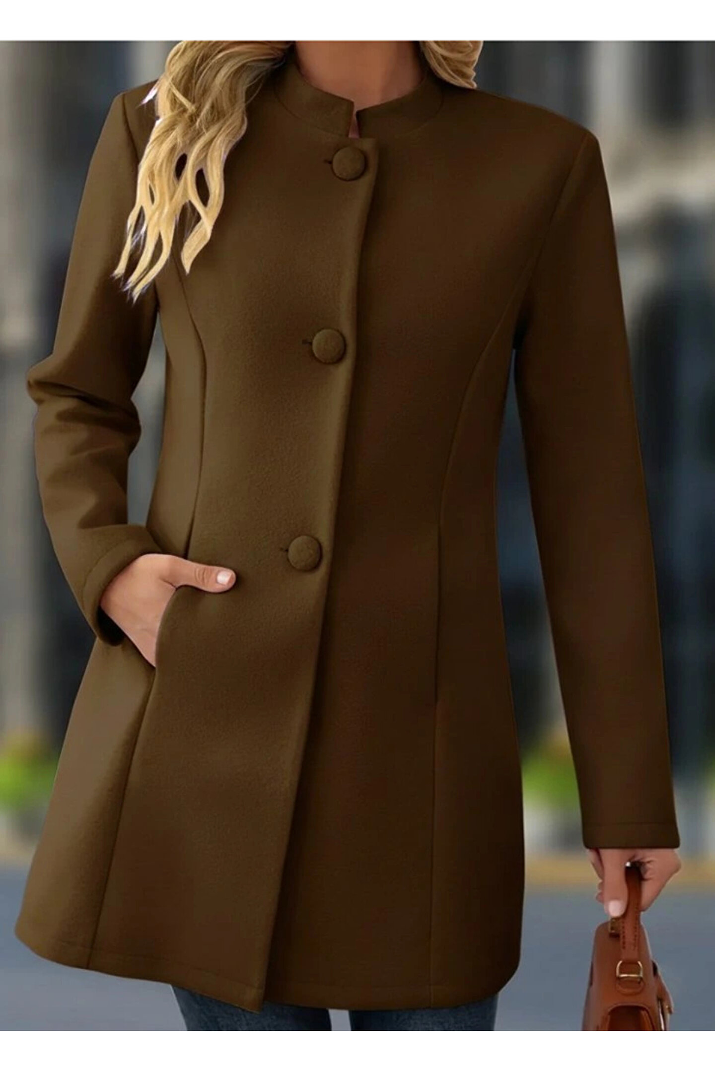 MDB Kadın Uzun Kollu Hakim Yakalı önden Düğmeli Cep Detaylı Kısa Taba Kaşe Kaban