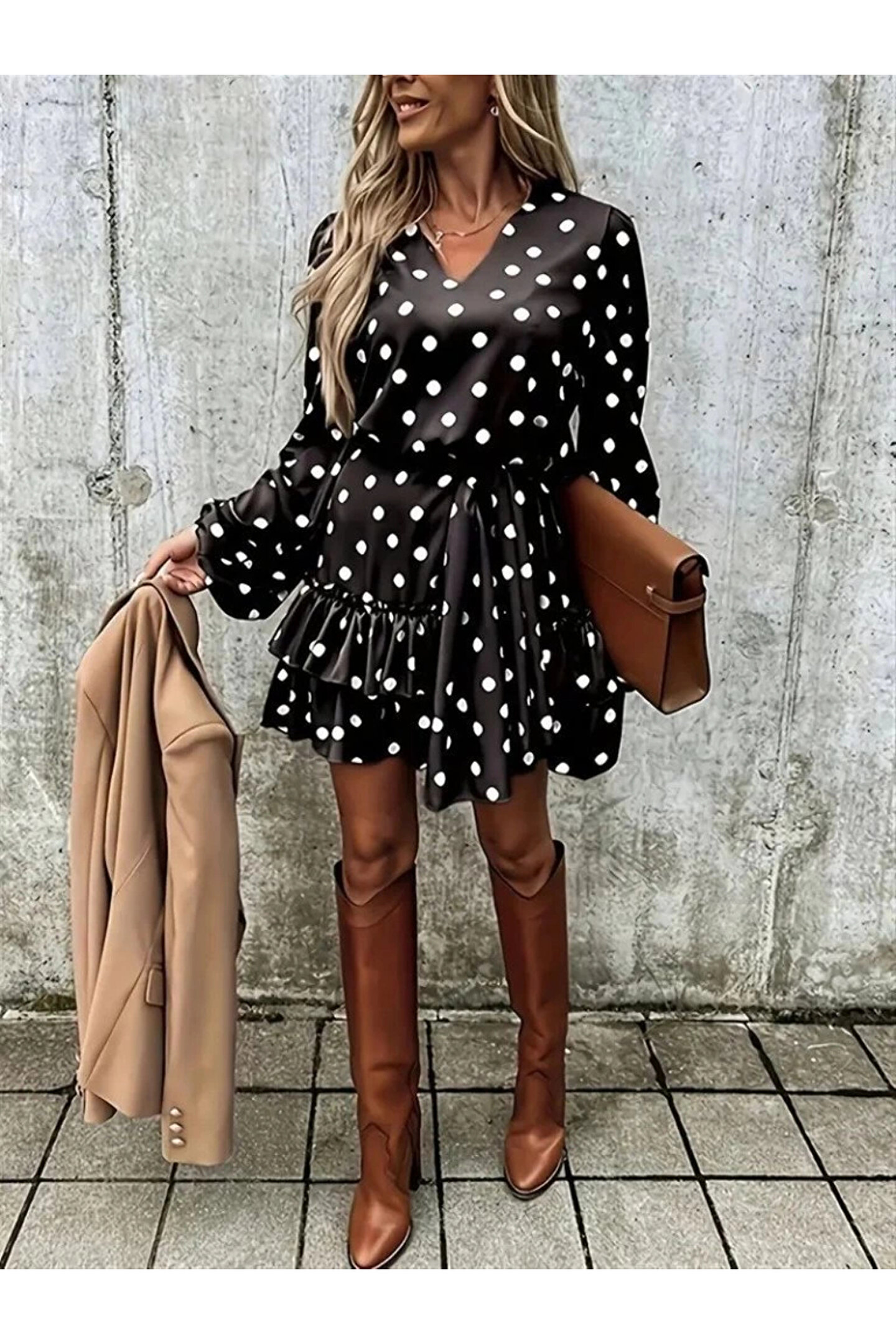 Kadın Uzun Kollu V Yakalı Belden Kuşaklı Puantiyeli Mini Modal Elbise