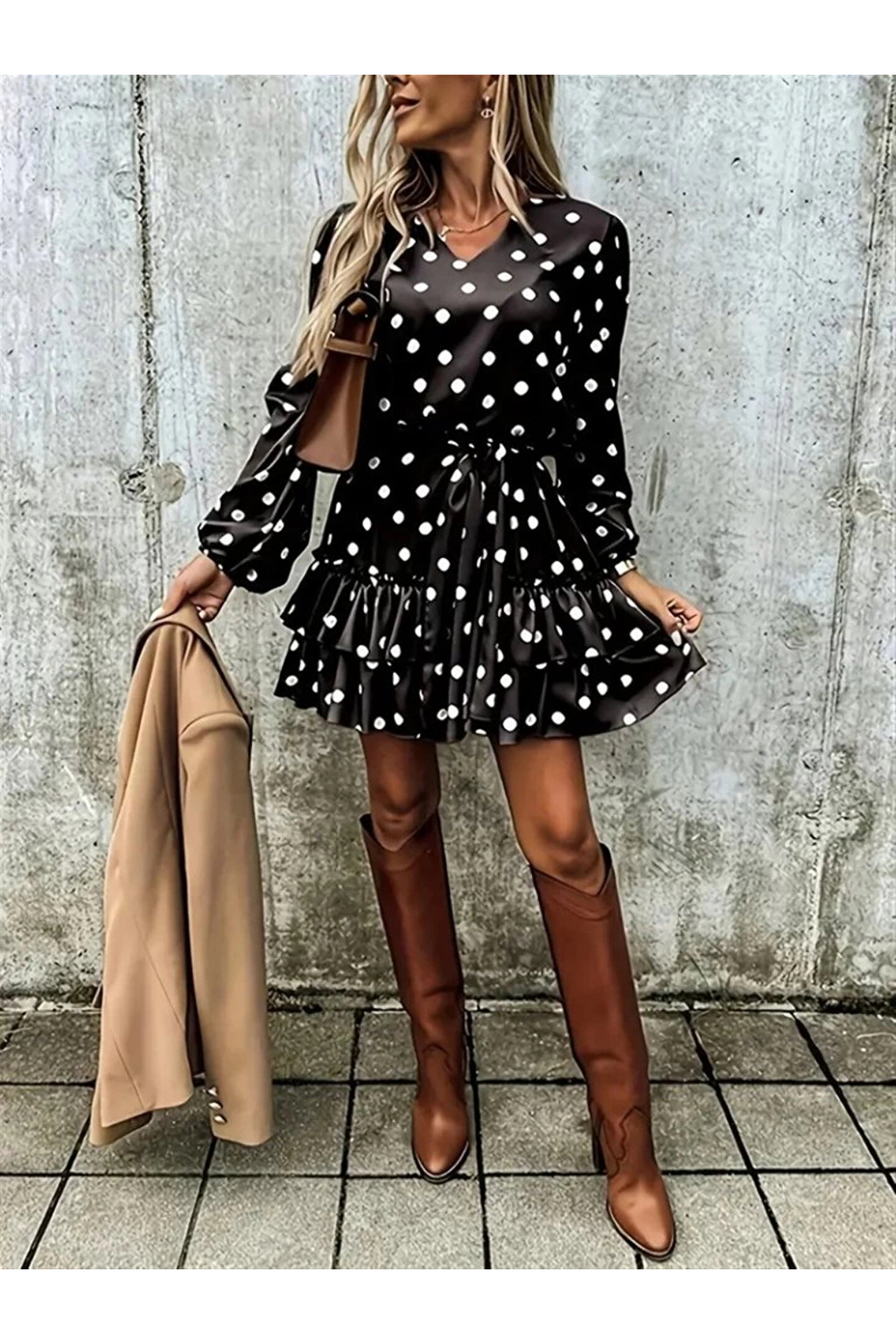MDB Kadın Uzun Kollu V Yakalı Belden Kuşaklı Puantiyeli Mini Modal Elbise