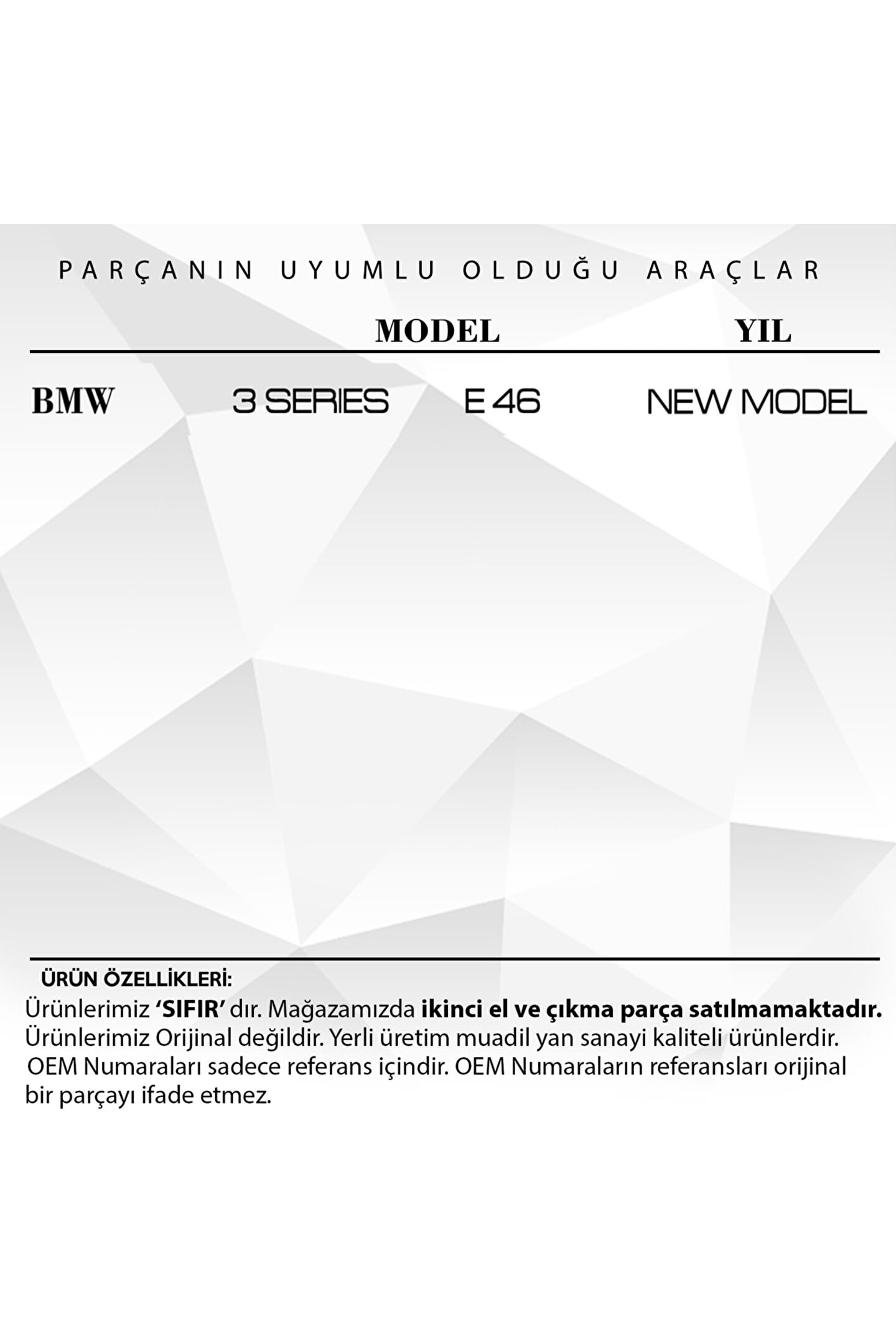 BMW 3 Serisi E46 için Cam Düğmesi Tamir Kapağı (BMW Yeni Model).; BMW'nin yeni model araçları için uyumlu olan bu cam düğmesi tamir kapağı, aracınızdaki aşınmış veya kırılmış düğmeleri yenilemek için mükemmel bir çözümdür.; Yüksek kaliteli plastik malzemeden üretilmiş olup, dayanıklı yapısıyla uzun ömürlü kullanım sunar.; Ergonomik yapısı sayesinde sürücülere ve yolculara konforlu bir kullanım sunar.; Montajı oldukça kolay olup, herhangi bir profesyonel yardıma gerek kalmadan kısa sürede monte edilebilir.; Bu ürün, BMW'nizin iç mekanını estetik ve işlevsel açıdan yeniler.; Ürün Kodu: WB2212