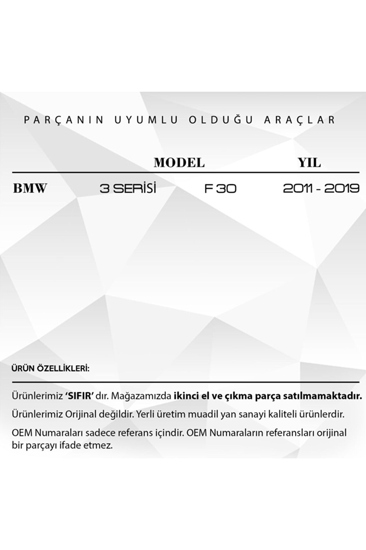 BMW 3 Serisi F30 için Port Bagaj Tavan Çıta Kapağı 4'lü Set.; Bu ürün, aracınızın estetik görünümünü artırmak için özel olarak tasarlanmış 4'lü set Port Bagaj Tavan Çıta Kapağıdır.; Paslanmaz malzemeden üretilmiştir, bu sayede uzun ömürlü ve dayanıklıdır.; Kolay montajı ile fark yaratır, hiçbir ekstra alete ihtiyaç duymadan kolayca monte edilebilir.; Aracınıza mükemmel bir uyum sağlar ve ona şık bir görünüm kazandırır.; Ayrıca, bagajınızı korur ve aynı zamanda taşıma kapasitesini artırır.; Bu ürün, aracınıza değer katar ve onu öne çıkarır.; Bu tavan çıtası kapak seti, hem güvenliği hem de görsel çekiciliği birleştirerek aracınıza mükemmel bir eklenti olacaktır.; Kendi aracınıza özgü bir görünüm elde etmek ve aynı zamanda bagajınızı en iyi şekilde korumak için bu tavan çıtası kapağı setini tercih edebil Ürün Kodu: SR2327-2