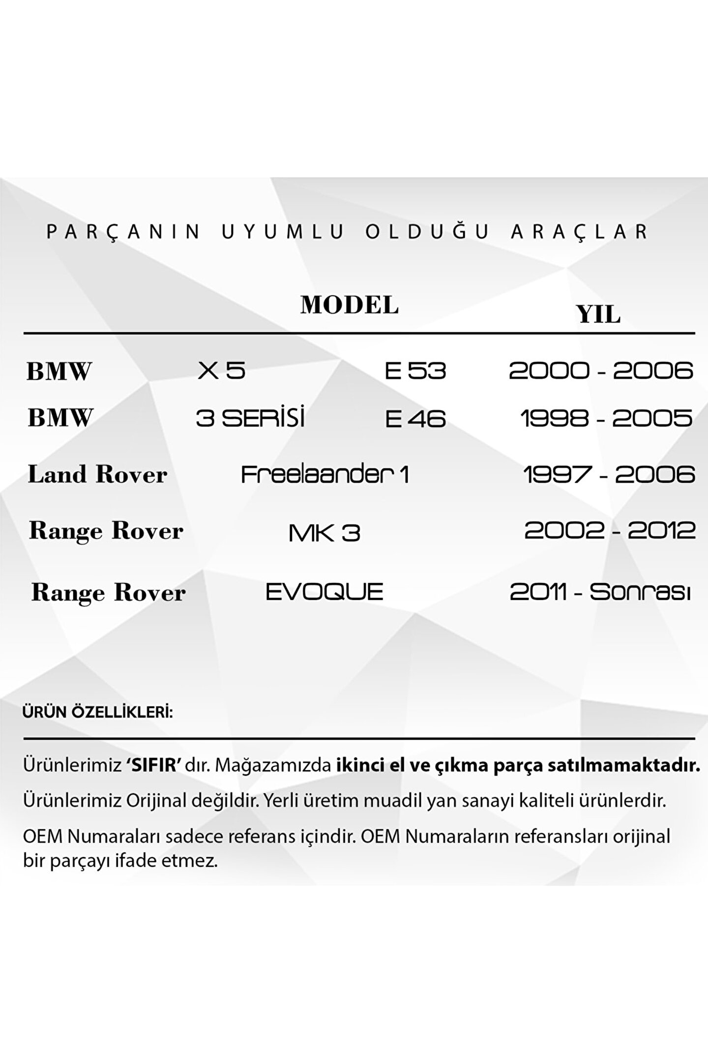 Mini Cooper.; BMW 3 Serisi X5 için Ayna Motor Dişlisi 3'lü Set.; Araba Ayna Motor Dişlisi 3'lü Set, MR2201 koduyla araçlarınızın performansını artırmak için ideal bir seçimdir.; Bu üstün kaliteli dişli seti, ayna motorunuzun çalışmasını sorunsuz ve verimli hale getirir.; Kendi sınıfında en iyisi olan bu dişli seti, dayanıklılığı ve güvenilirliğiyle bilinir.; Sürüş esnasında yan aynalarınızın pozisyonunu kolaylıkla ayarlamanıza olanak sağlar.; Yüksek kaliteli malzemelerden üretilmiştir ve uzun ömürlü kullanım için tasarlanmıştır.; Araba Ayna Motor Dişlisi 3'lü Set, sürüş deneyiminizi daha güvenli ve konforlu hale getiren bir üründür.; Bu ürün, araçlarınızın yan aynalarının performansını ve dayanıklılığını önemli ölçüde artırır.