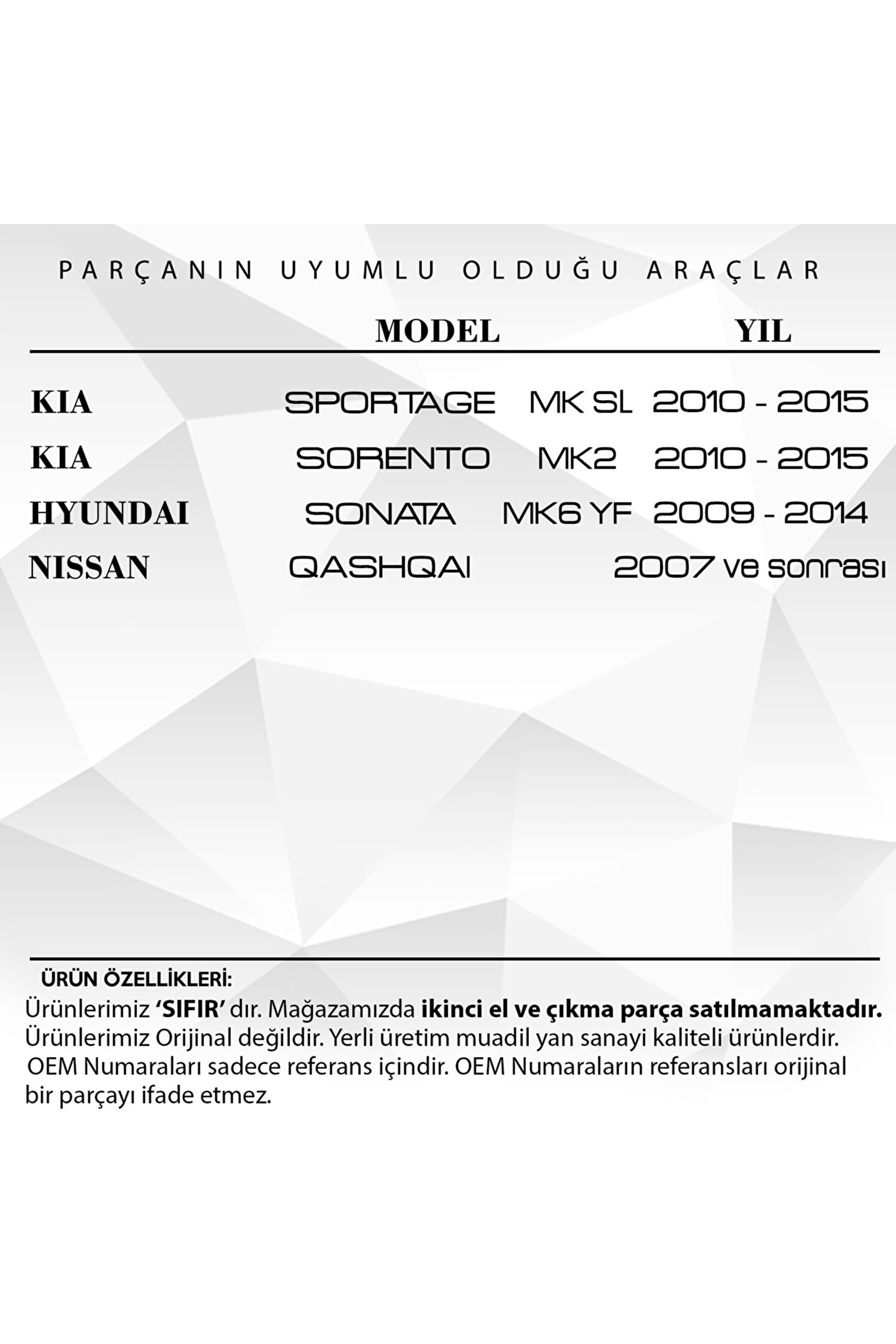 Kia Sportage.; Sorenta.; Hyundai Sonata için Yan Ayna Dişlisi Seti.; Araba Yan Ayna Dişlisi Seti (Ürün Kodu: MR2273), otomobilinizin yan aynalarını kontrol etmek için gereken mükemmel bir çözümdür.; Bu dişli seti, aynalarınızın sorunsuz ve etkin bir şekilde çalışmasını sağlar, böylece sürüş güvenliğinizi artırır.; Olağanüstü dayanıklılığı ile bilinen bu ürün, uzun ömürlü bir performans sunar.; Ayrıca, kolay kurulum özelliği sayesinde hızlı ve etkin bir şekilde monte edilebilir.; Araba Yan Ayna Dişlisi Seti, hassas üretim sürecinden geçer ve mükemmel işlevsellik sunar.; Bu ürün, sürüş deneyiminizi geliştirmeye yardımcı olur ve otomobilinizin genel performansına katkıda bulunur.