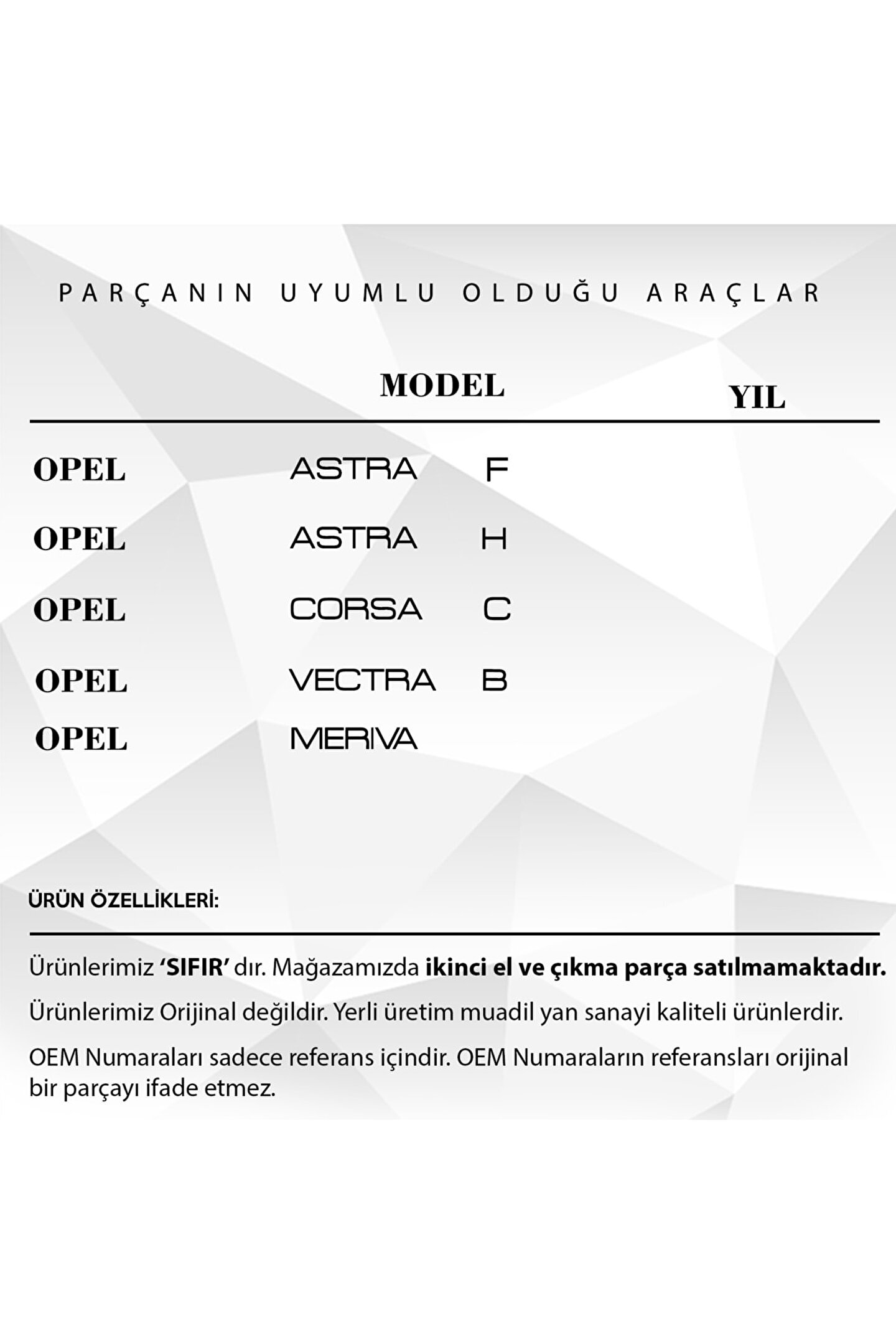 Opel Astra F-H.; CorsaC.; VectraB.; Meriva için Fren Pedal Lastiği.; Araba Fren Pedal Lastiği (Ürün Kodu: PDL2206), sürüş güvenliğinizi artırmak için tasarlanmıştır.; Bu dayanıklı pedal lastiği, pedalın üzerinde mükemmel bir kavrama sağlar ve ayaklarınızın kaymasını önler.; Böylece frenleme sırasında maksimum kontrol sağlar.; Kolay montajı sayesinde, kısa sürede ve minimum çaba ile aracınıza uygulanabilir.; Fren pedallarınızın ömrünü uzatarak, uzun vadede maliyet tasarrufu sağlar.; Yüksek kaliteli malzemeden üretilmiştir ve sert hava koşullarında dahi dayanıklılığını korur.; Bu pedal lastiği, tüm araç tiplerine uyum sağlar ve sürüş deneyiminizi geliştiren bir aksesuardır.; Kısacası, Araba Fren Pedal Lastiği, sürüş güvenliğiniz ve konforunuz için ideal bir seçimdir.