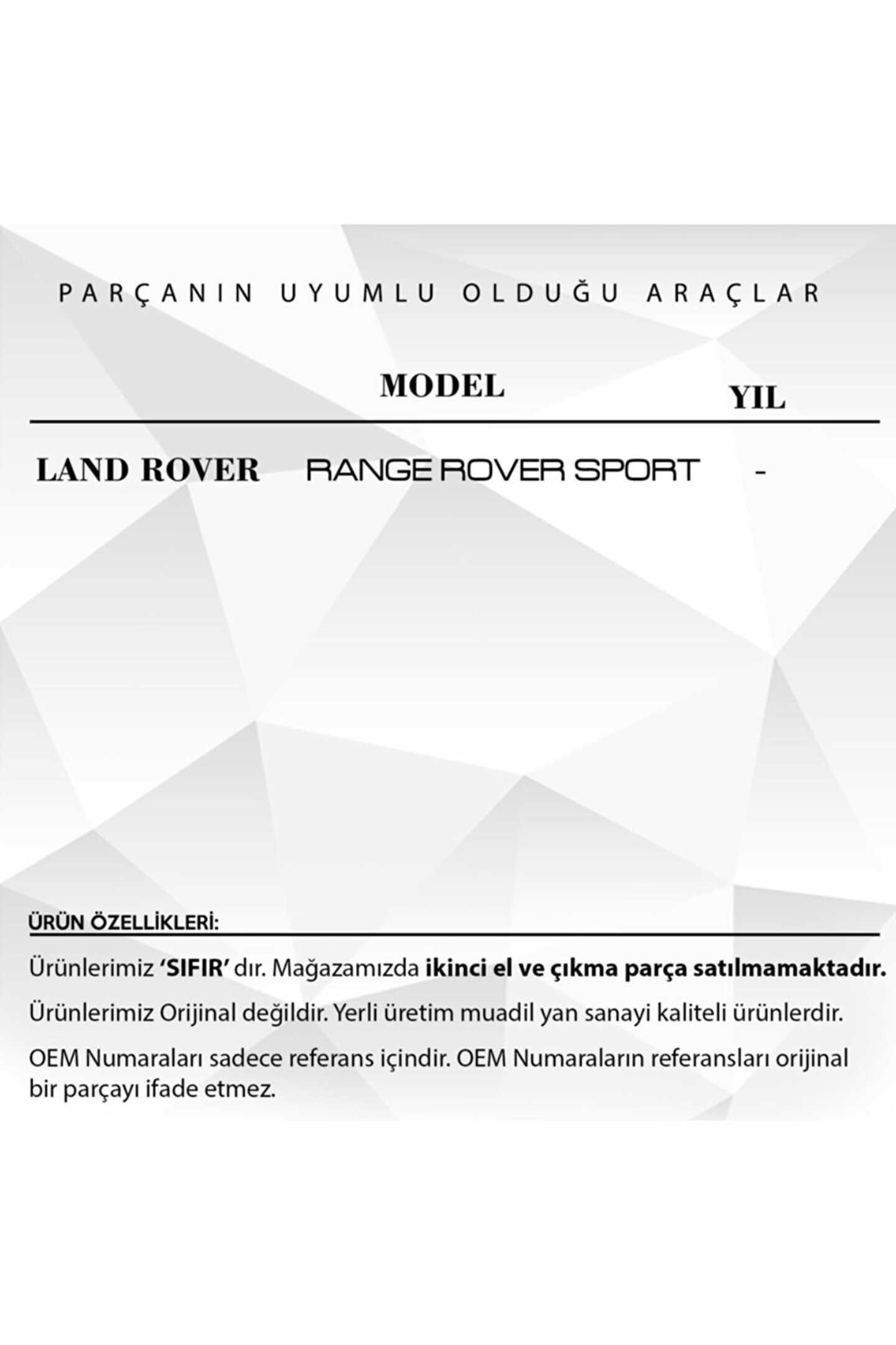 Range Rover Sport Cam Düğmesi Kapağı 2 Adet Sağ ve Sol.; Range Rover Sport araçları için uyumlu olan bu cam düğmesi kapakları seti, 2 adet sağ ve sol düğme içerir.; Yüksek kaliteli plastik malzemeden üretilmiş olup, dayanıklı yapısıyla uzun ömürlü kullanım sunar.; Cam açma kapama işlevlerini kusursuz bir şekilde yerine getirir.; Ergonomik yapısı ile sürücülere ve yolculara konforlu bir kullanım sunar.; Montajı kolay olup, herhangi bir profesyonel yardıma gerek kalmadan kısa sürede monte edilebilir.; Bu ürün, aracınıza estetik ve işlevsellik kazandırır.; Ürün Kodu: WB2214