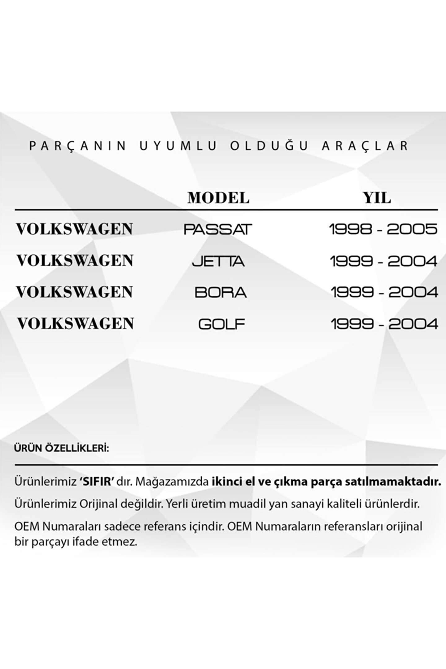 VW Golf.; Bora.; Jetta.; Passat için Cam Düğmesi Çerçeve Kapağı.; Volkswagen Golf, Bora, Jetta ve Passat modelleri için uyumlu olan bu cam düğmesi çerçeve kapağı, iç mekanınızdaki aşınmış veya kırılmış düğme çerçevelerini yenilemek için mükemmel bir çözümdür.; Yüksek kaliteli plastik malzemeden üretilmiş olup, uzun ömürlü kullanım sunar.; Estetik yapısı sayesinde aracınızın iç mekanına uyum sağlar ve yenilenmiş bir görünüm sunar.; Montajı son derece kolay olup, profesyonel yardım gerektirmeden kısa sürede monte edilebilir.; Bu yedek parça, aracınızın iç mekanını tazelerken, düğme işlevselliğini ve kontrolünü .; Aracınızın değerini artıracak dayanıklı ve şık bir çözümdür.; Ürün Kodu: WB2255