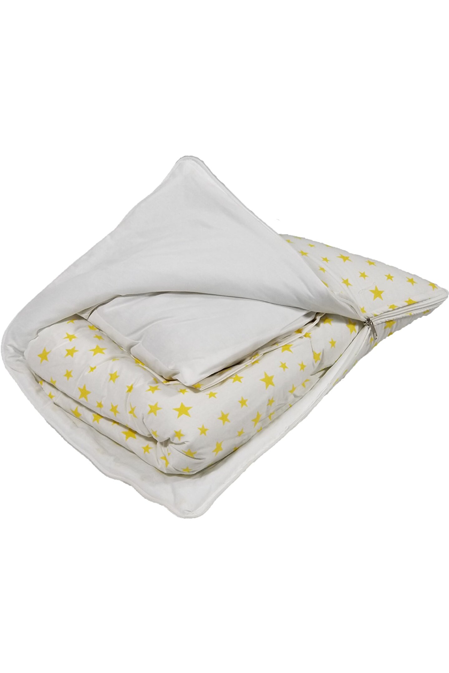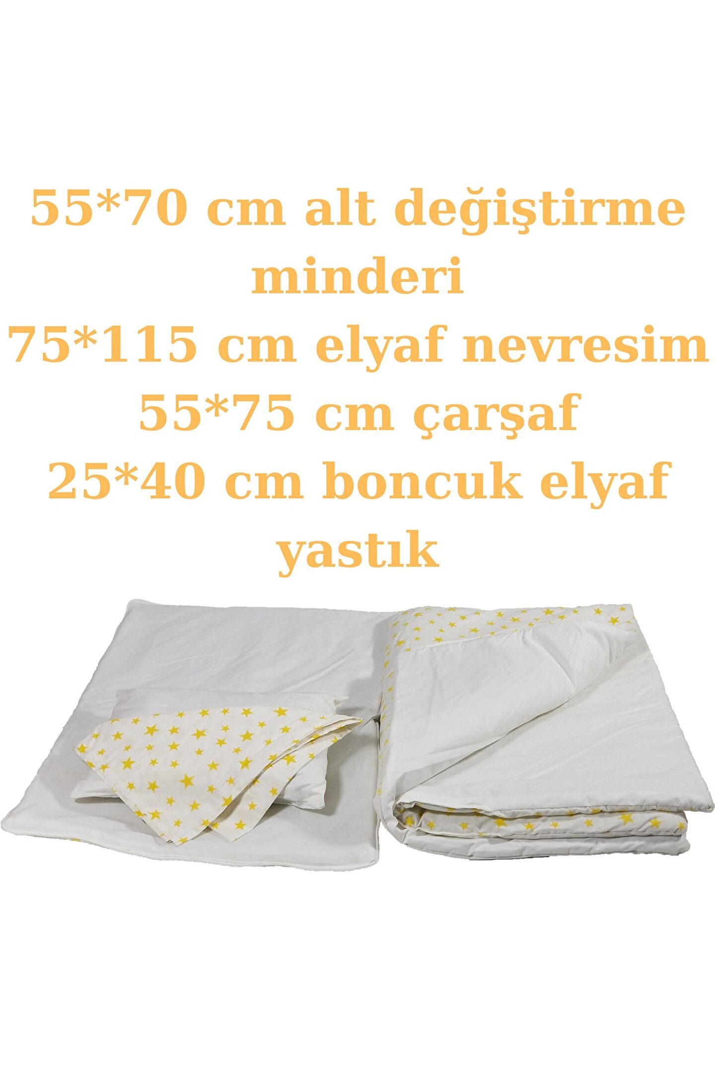Sarı yıldızlı deseniyle şık ve neşeli bir görünüm sunar, bebeğinizin odasına renk katar; Beşik içi nevresim takımı olarak tasarlanmıştır, bebeğinizin rahat bir uyku deneyimi için idealdir;