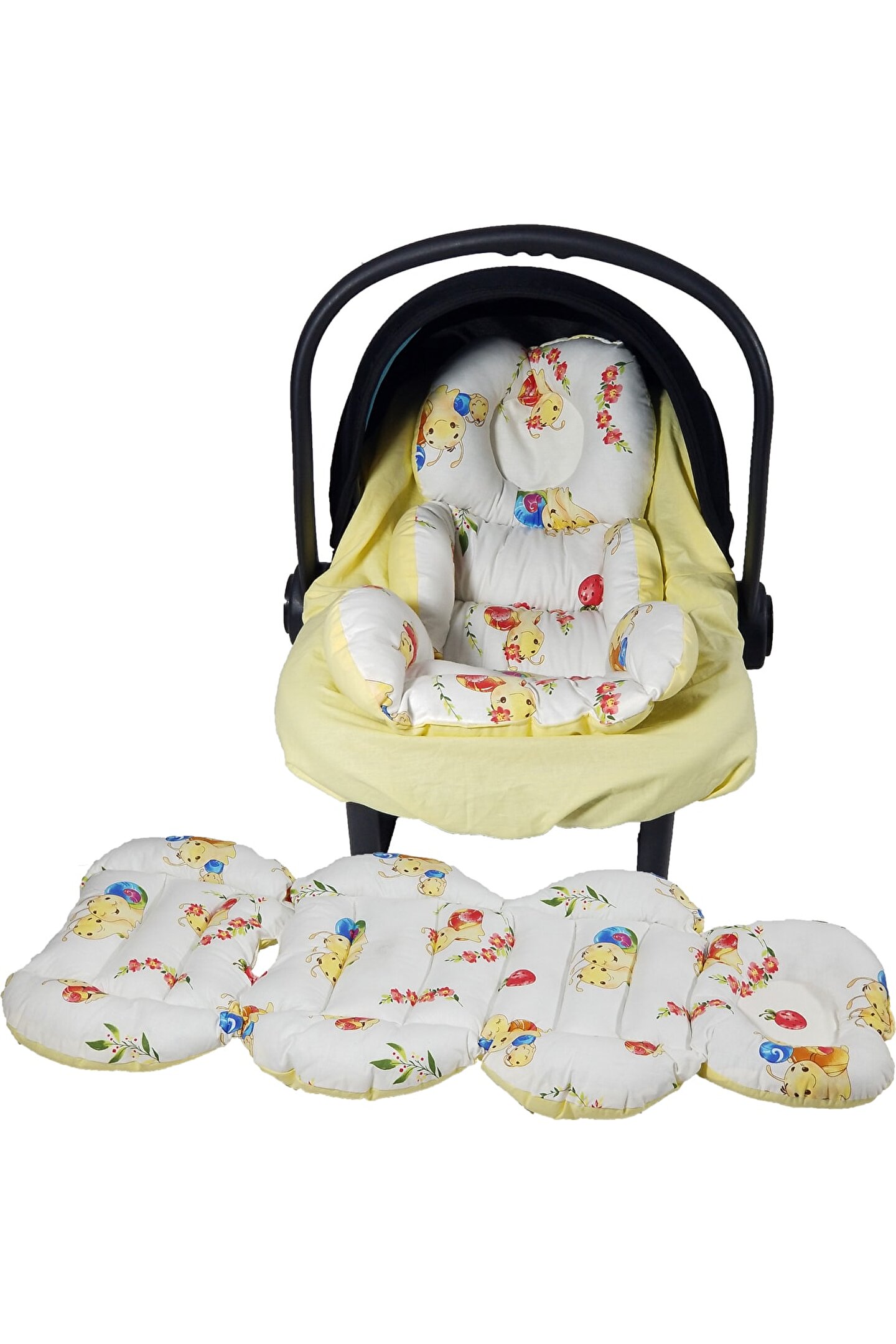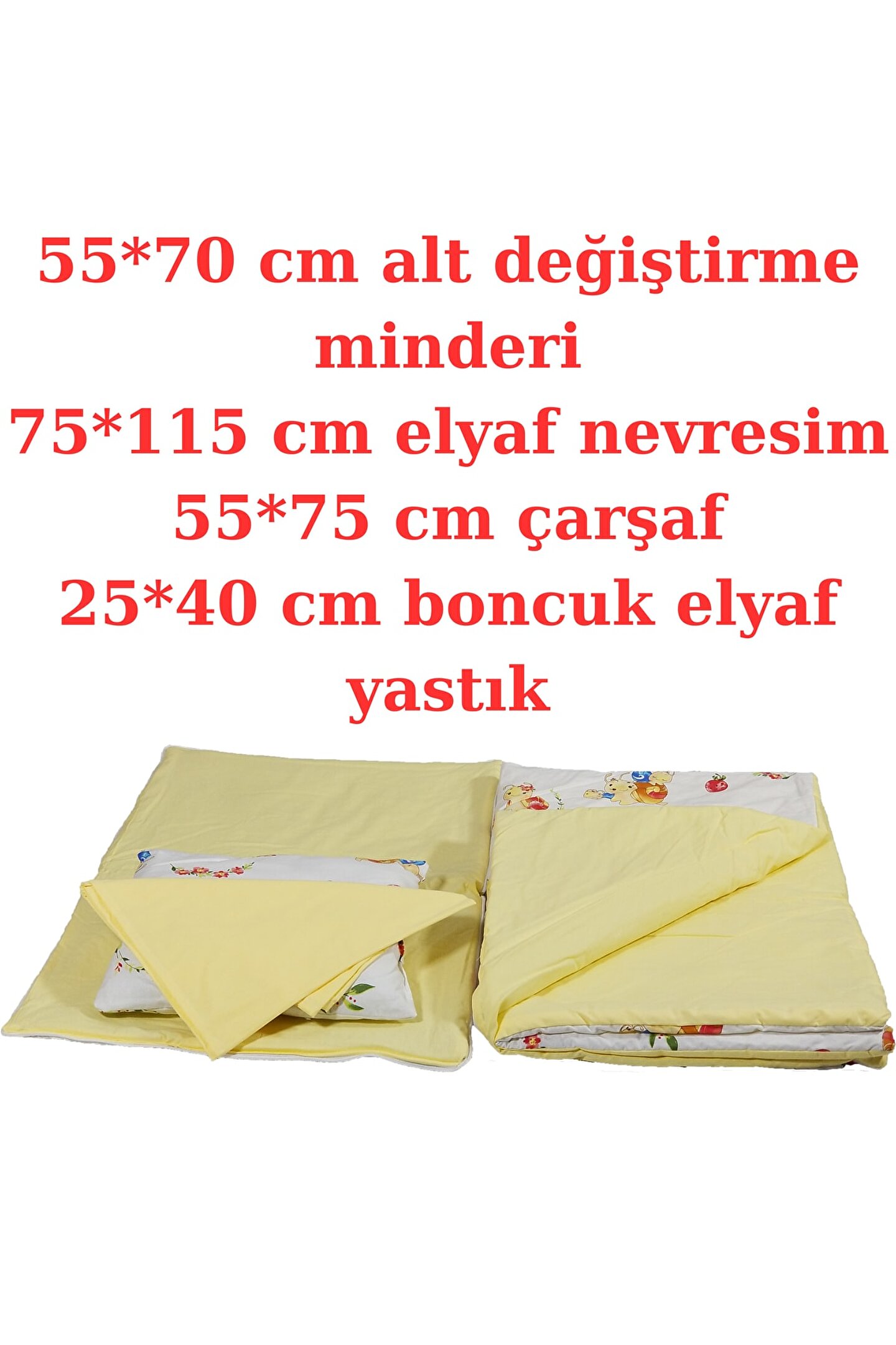 10'lu yeni doğan setimiz %100 pamuklu kumaştan üretilmiştir, Kenarları ezilmez ve toplanmaz silikonlu 1. sınıf boncuk elyafla doldurulmuştur. Ortopedik kulaklı yastık düz kafa yastığı, Uç kısmında bulunan yıldızlı ipler ile ürün boyu istediğiniz genişlikte ayarlanabilir. Bir buçuk yaşına kadar kullanılabilir. Dıştan dışa 100x65 cm dir. İç ölçüleri 75x35 cm dir. Bebeklerinizi, gittiğiniz her yerde rahatlıkla kendi temiz ortamında gibi uyutabileceksiniz. Pike battaniye 80 x 80 cm % 100 pamuklu kumaştan üretilmiştir terleme ve koku yapmaz. Paket içerisin de; düz kafa yastığı ve pike bulunmaktadır. Paket içerisin de; Babynest, Düz kafa yastığı, pike Puset örtüsü, puset çarşafı, puset minderi, Çocuk araba minderi (araç içi koltuk minderi olarakta kullanılmaktadır), Emzirme örtüsü olarak gönderim yapılmaktadır. Emzirme önlüğü 75*115 cm dir, boyun askısı çıt çıtlıdır ve 3 kademelidir kendi bedeninize göre ayarlayabilirsiniz. Tüm pusetler için uygun ölçüde tasarlandığından gönül rahatlığı ile tercih edilebilir. Bebeğinizi güneşten rüzgardan tozdan korur. Yerli üretimdir...