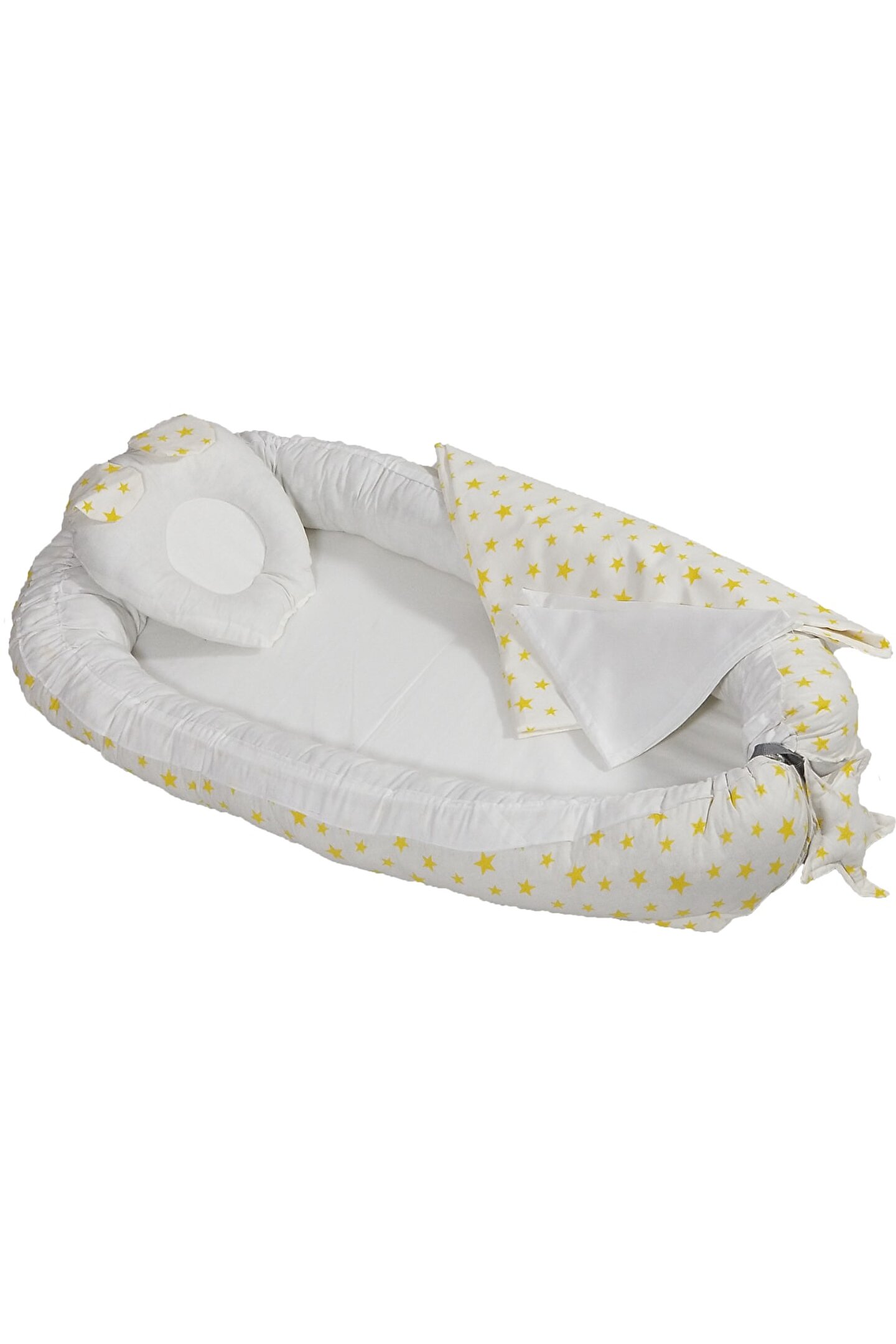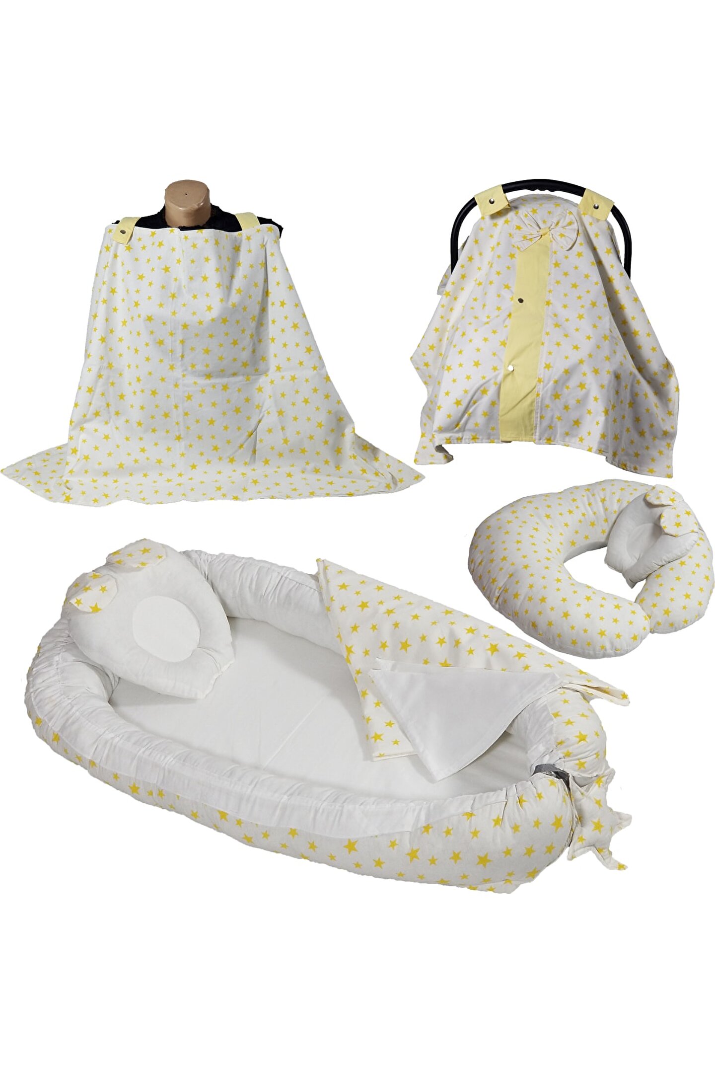 10'lu yeni doğan setimiz %100 pamuklu kumaştan üretilmiştir, Kenarları ezilmez ve toplanmaz silikonlu 1. sınıf boncuk elyafla doldurulmuştur. Ortopedik kulaklı yastık düz kafa yastığı, Uç kısmında bulunan yıldızlı ipler ile ürün boyu istediğiniz genişlikte ayarlanabilir. Bir buçuk yaşına kadar kullanılabilir. Dıştan dışa 100x65 cm dir. İç ölçüleri 75x35 cm dir. Bebeklerinizi, gittiğiniz her yerde rahatlıkla kendi temiz ortamında gibi uyutabileceksiniz. Pike battaniye 80 x 80 cm % 100 pamuklu kumaştan üretilmiştir terleme ve koku yapmaz. Paket içerisin de; düz kafa yastığı ve pike bulunmaktadır. Paket içerisin de; Babynest, Düz kafa yastığı, pike Puset örtüsü, puset çarşafı, puset minderi, Çocuk araba minderi (araç içi koltuk minderi olarakta kullanılmaktadır), Emzirme örtüsü olarak gönderim yapılmaktadır. Emzirme önlüğü 75*115 cm dir, boyun askısı çıt çıtlıdır ve 3 kademelidir kendi bedeninize göre ayarlayabilirsiniz. Tüm pusetler için uygun ölçüde tasarlandığından gönül rahatlığı ile tercih edilebilir. Bebeğinizi güneşten rüzgardan tozdan korur. Yerli üretimdir...