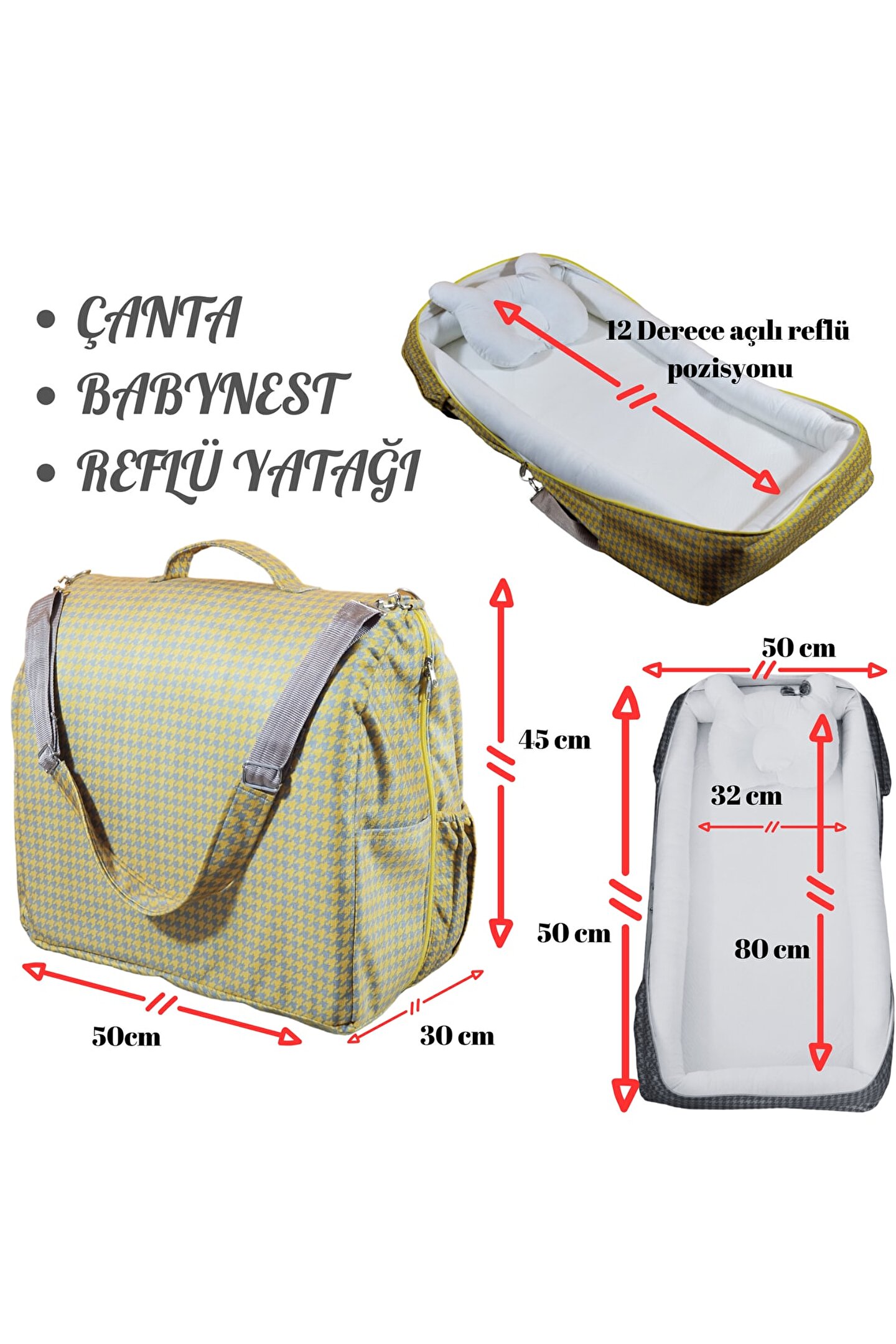 Omuz askısı ile rahat taşıma olanağı sunmaktadır. ; Dış yüzey kazayağı desenli dokuma kumaştan üretilmiştir. ; Yatak bölümü %100 pamuklu yatak kumaşından üretilmiştir. ; Yatak bölümünde su geçirmez tela kaplı 3*45*90 cm ölçülerinde sünger vardır. ; Yatak etrafın da 5cm çapında koruyucu bariyer bulunmaktadır. ; Reflü bölümünde de su geçirmez tela kaplı olup 30*40 cm ölçülerinde %12 eğimli reflü süngeri vardır. ; Reflü sünger ihtiyacı bittiğin de reflü süngeri çekarılarak ekstra cep olarak kullanılmaktadır. ; Çantalı reflü yatağımızın tamamın da renk uyumlu kaliteli paslanmaz çelik aparatlar kullanılmıştır, Çantanın kalitesinin yanın da şık bir görünüm oluşturmaktadır. ; Çanta yanların da 4 adet cep bulunmaktadır. ; Ortalama 2,5 kg dır. ; Sünger ve elyaf desteği çıkarılarak rahatlıkla çamaşır makinasında yıkana bilir.;
