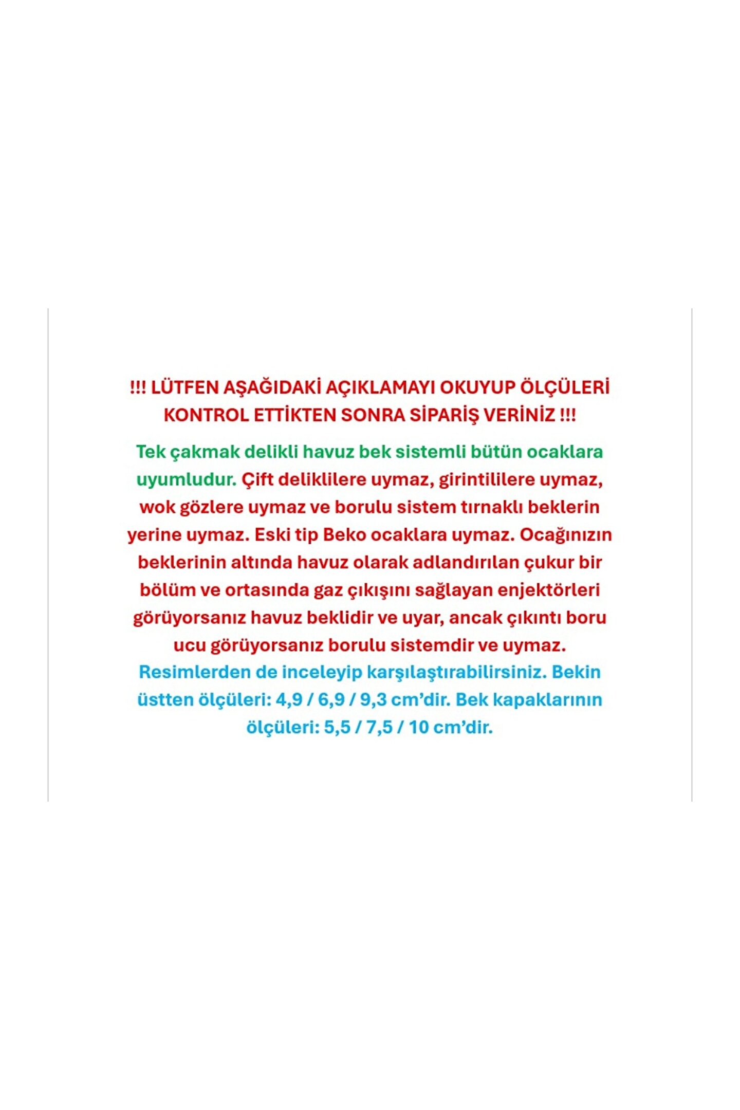Kapağın altındaki beki ters çevirdiğinizde giriş 3 bacaklıdır ocak 4 bacaklı ise uyum sağlamaz; Büyük göz :üst kapak : 100 mm-alt kapak : 93 mm; Orta gözler :üst kapak : 75 mm alt kapak : 69 mm; Küçük göz : üst kapak : 55 mm alt kapak : 49 mm; Çeşitli markalara uyumludur.; Havuz bek sistemli bütün ocaklara uyumludur.; -Ocağınızın beklerini kaldırdığınızda havuz diye adlandırılan çukur alüminyum bölüm ve ortasında gaz çıkışını sağlayan enjektör görüyorsanız ocağınız havuz beklidir ve bu ürünümüz ocağınıza uygundur.; -Ocağınızın beklerinin altında çukur yerine çıkıntı boru ucu görüyorsanız ocağınız borulu sistemdir ve bu ürünümüz ocağınıza uymaz