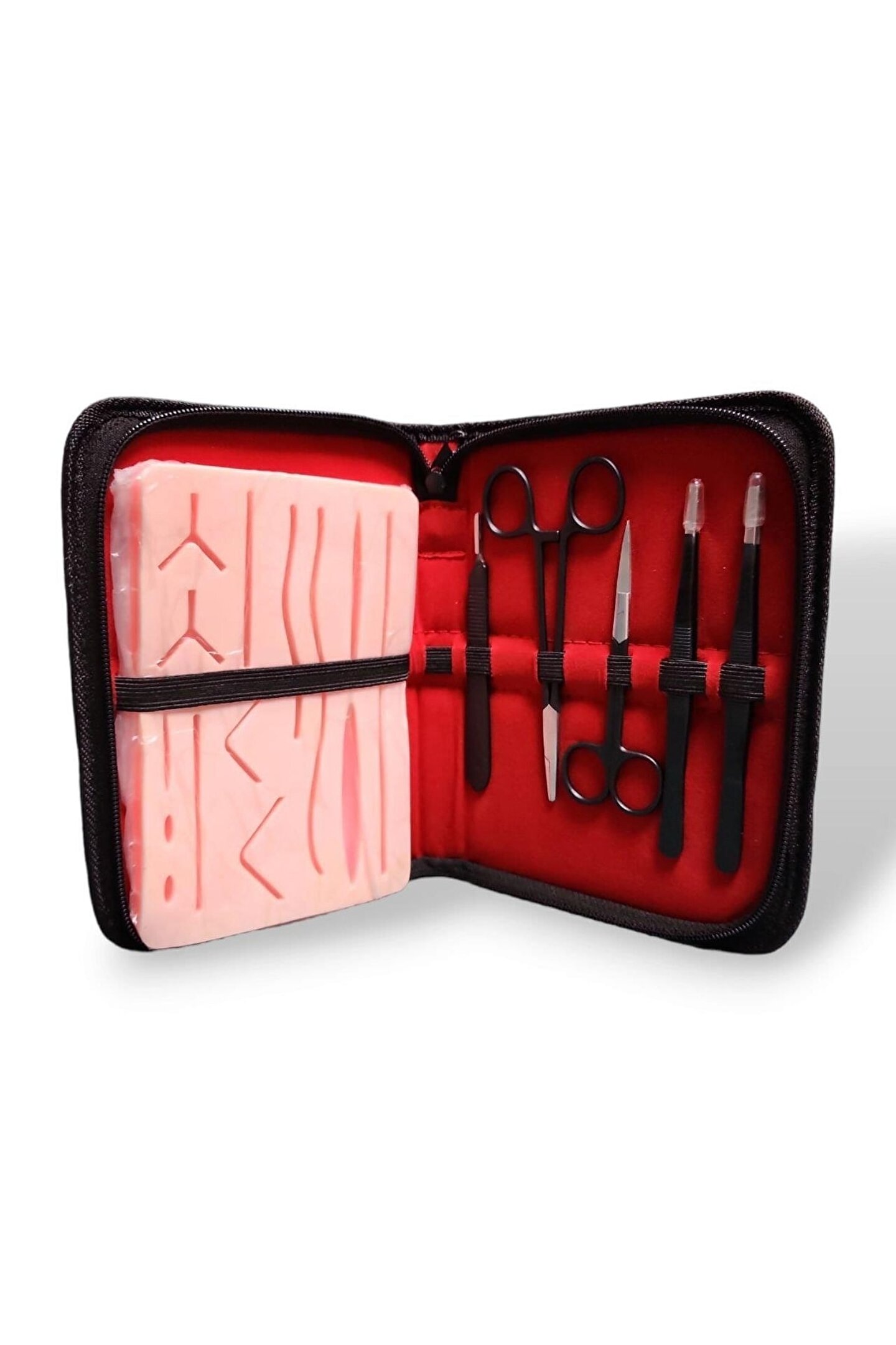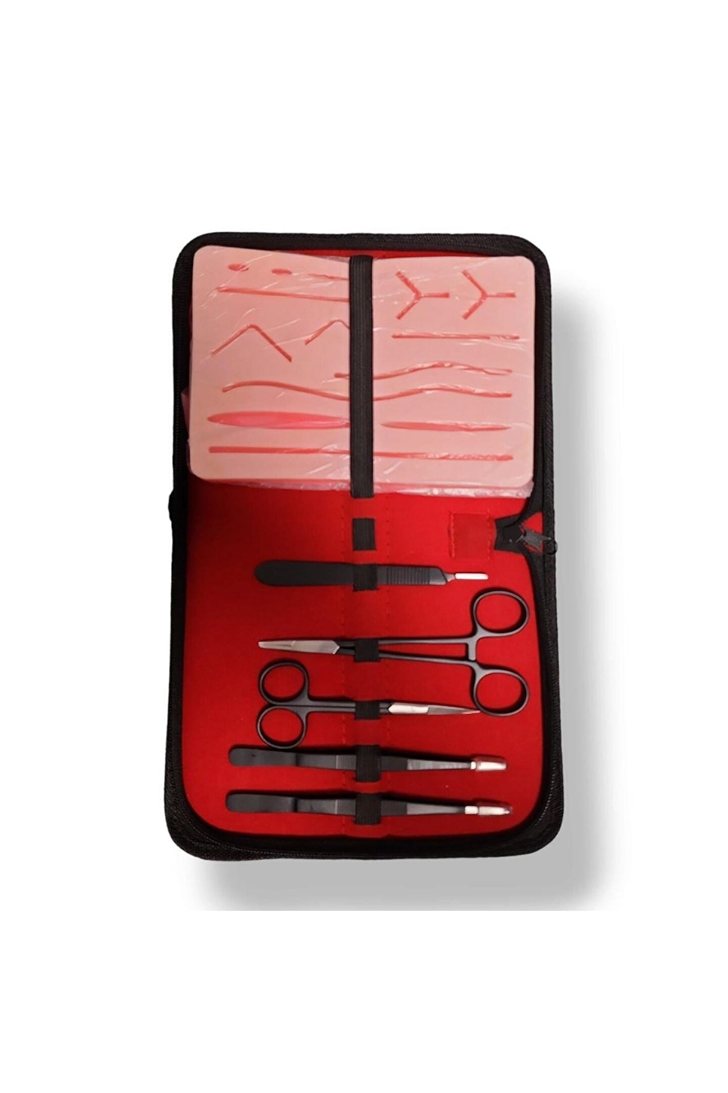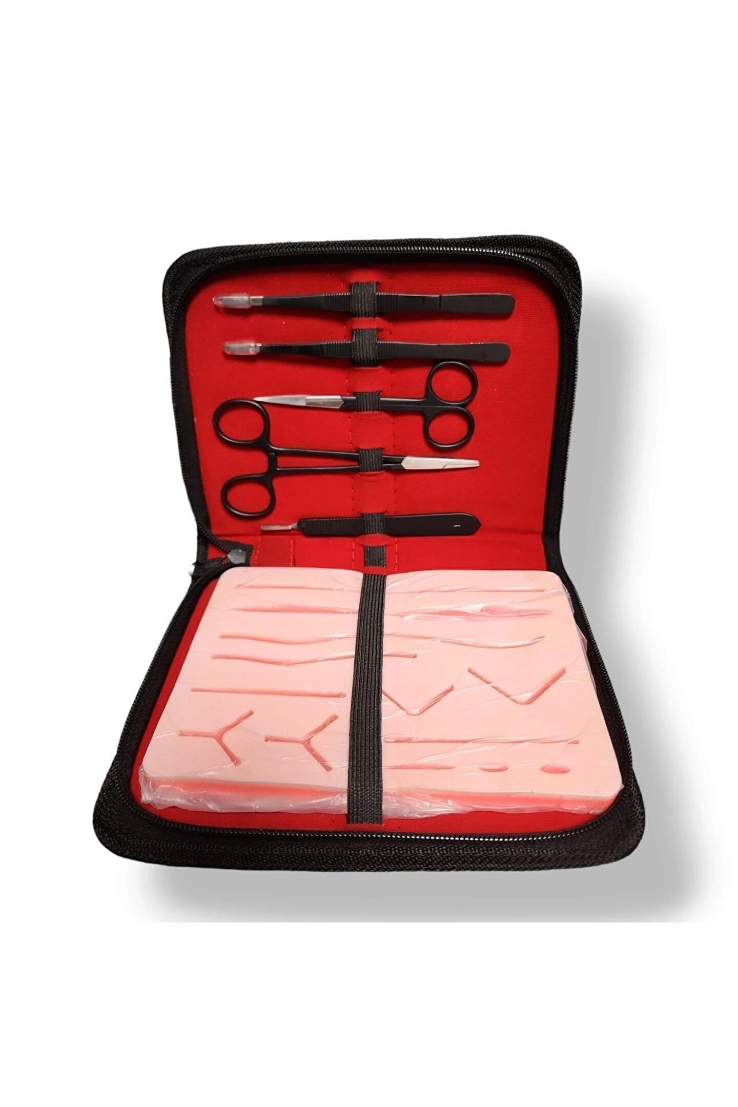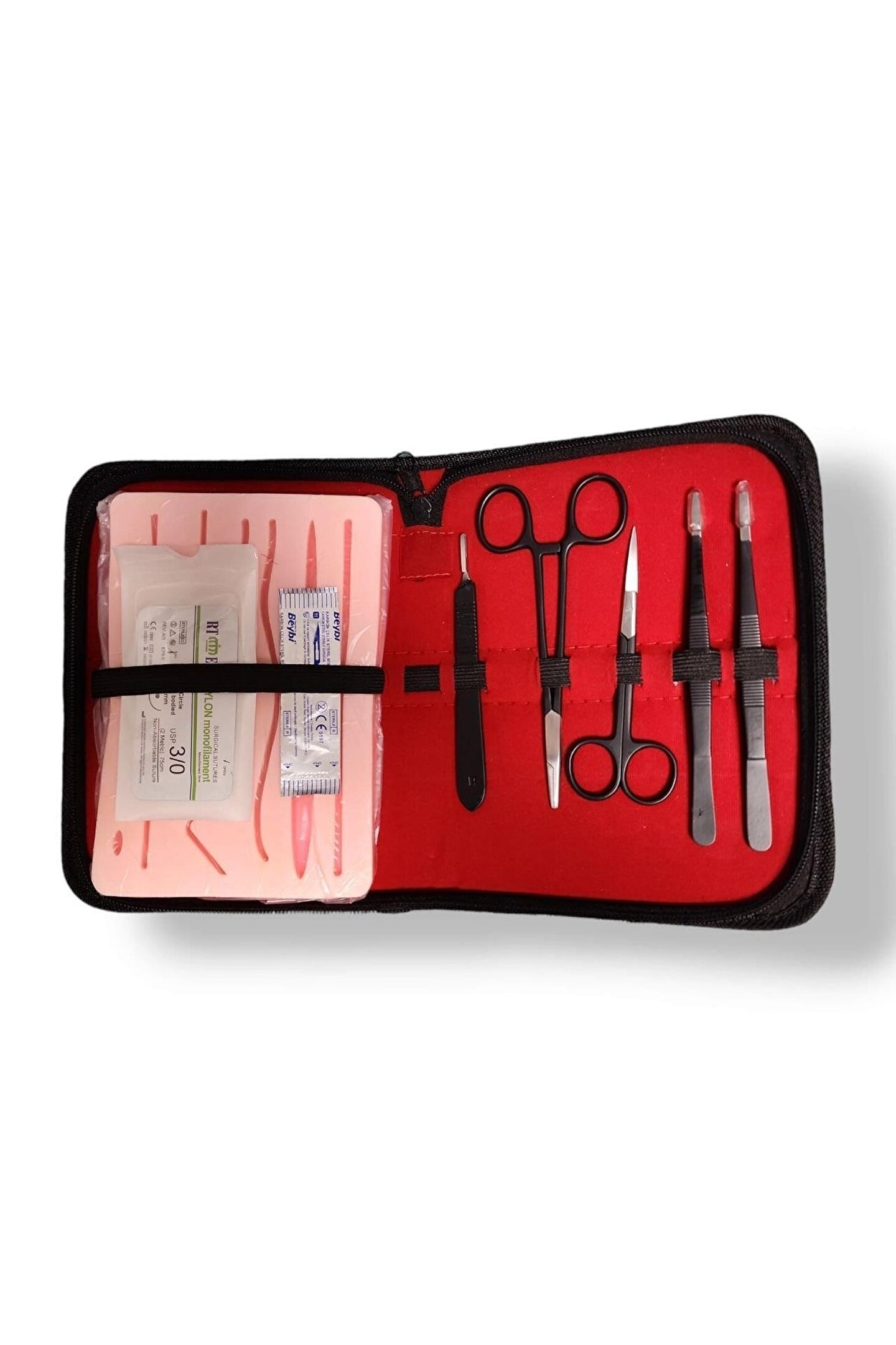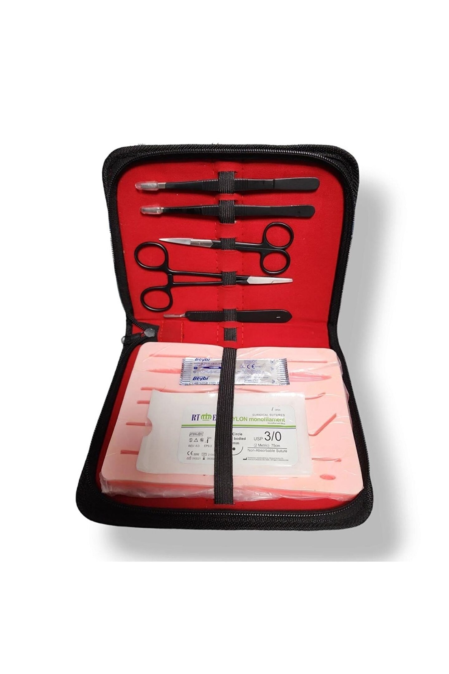 Cerrahi Dikiş Eğitim Seti Dark Black (Sütur Eğitim Seti) Kesik sutur eğitim seti klinik dikiş becerilerini geliştirmeyi sağlayan sutur eğitim setidir. ; Doku üzerinde bulunan hazır kesiler sayesinde kesi atmadan sutur çalışması yapılabilir. ; Kutu içeriğinde bulunan set 1. ; sınıf paslanmaz çeliktendir ve steril edilebilir. ; Sete özel taşıma ve saklama çantası bulunmaktadır. ; Sette bulunanlar · 1 adet bistur sapı No:3 · 2 adet bistur ucu · 1 adet dişsiz penset · 1 adet portegue · 1 adet sutur makası · 1 adet dişli penset · 2 adet iplik iğneli · 1 adet kesik sutur eğitim dokusu · CE belgeli ve CE standartlarına uygun üretilmiştir.;
