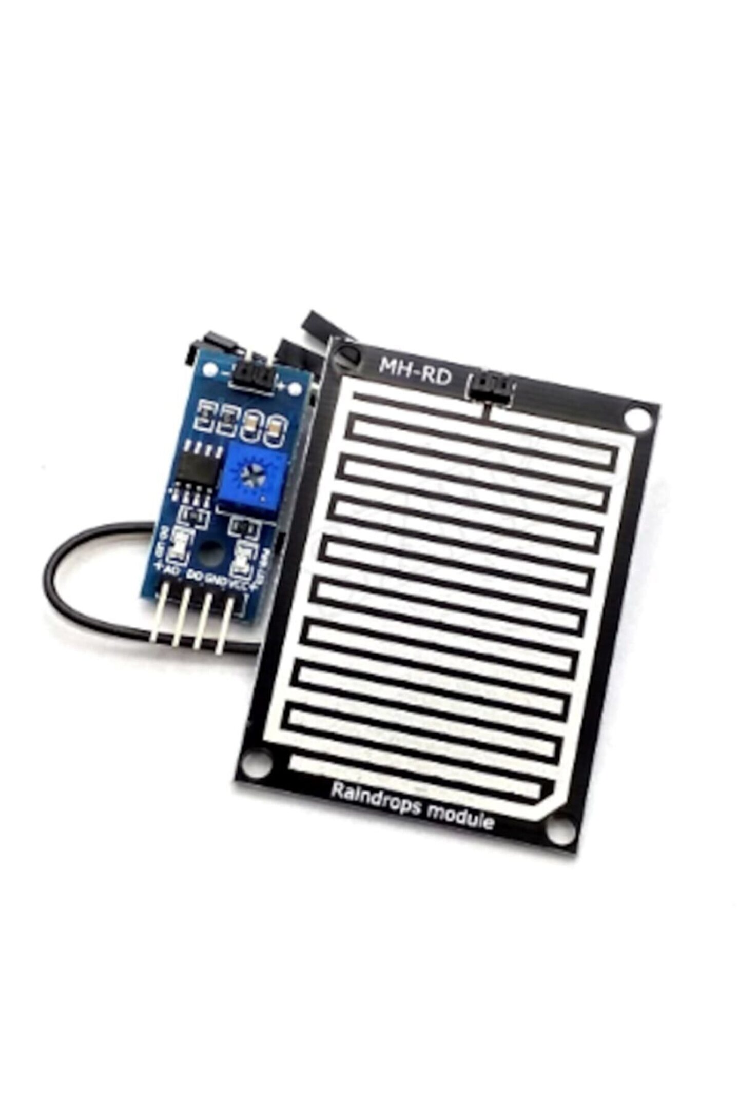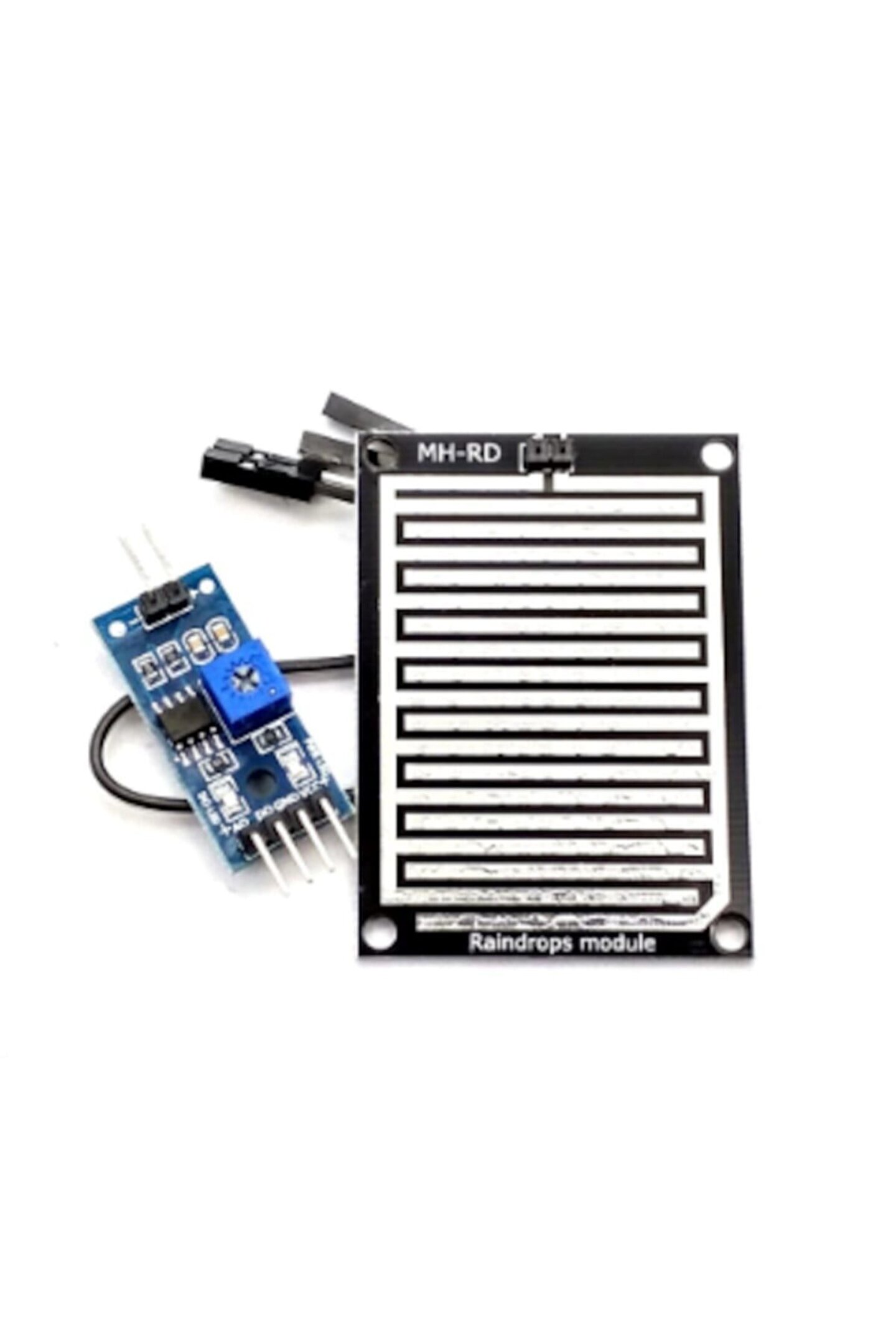Arduino Yağmur Sensörü - Rain Sensör, Modül Bu sensör yağmur ve su damlası sensörü olarak kullanılabilen bir üründür. ; Birbirine paralel olarak çekilmiş iletken hatların su ile teması sonucu sensör çıkış pininde analog bir değer okunabilmektedir. ; Arduino başta olmak üzere bir çok mikrodenetleyeci platformu ile beraber kullanılabilir. ; Sensör kullanımı oldukça basittir. ; Besleme voltajı ve toprak bağlantısı yapılarak, sensör çıkış bacağından okuma yapılabilmektedir. ; Hem dijital hem analog çıkış verdiğinden dolayı, farklı sistemlere rahatlıkla uyarlanabilir. ; Sensör üzerindeki pot yardımı ile de sensör hassasiyeti ayarlanabilmektedir.;