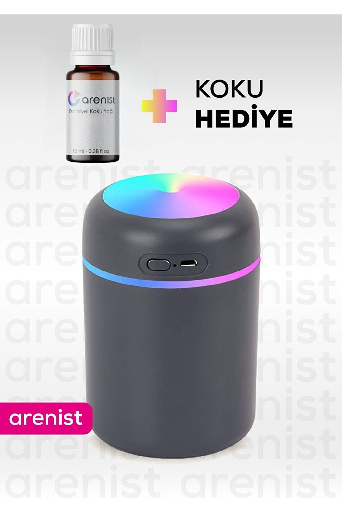 ARENİST 300 Ml Ultrasonik Hava Nemlendirici Buhar Makinesi Ve Aroma Difüzörü 300 ml kapasiteli su tankı,değişen renkli led lambası,ergonomik tasarımıyla evinizin veya arabanızın atmosferini değiştirebilirsiniz. ; Ultrasonik hava nemlendirici özellikleri : Ultrasonik buhar teknolojisi yüksek frekanslı ses dalgalarıyla ,suyun su buharına dönüştürülmesidir.Kapalı alanlarda bulunan nem miktarının ideal ve sağlıklı seviyeye gelmesini sağlamaktadır.Aynı zamanda cilt,burun,boğaz ve dudakların kuruluğunu tedavi etmek için özellikle etkili olabilir.Yüksek kaliteli abs ve silikondan yapılmıştır.Renkli led ışığıyla odanızda gece lambasına dönüşebilir.Gece ışığı ve nemlendiriciyi bir araya getirebilir ve günlük yaşamınızı daha akıllı hale getirir.Odanızın rahatlatıcı tütsü yaymasını sağlamak için tanka oda parfümü veya uçucu yağ ekleyebilirsiniz.(suyun içine damlatarak). ; Ayrıca su veya alkol bazlı dezenfektan koyarak bulunduğunuz ortamın dezenfeksyonunu yapabilirsiniz. ; Led ışık yakmak için açma-Kapatma düğmesine uzun basmanız gerekmektedir. ; Kullanma talimatı: 1- Ürün kapağını çevirerek yukarı kaldırın, 2- Hazneye su doldurun, 3- Usb güç kablosunu takın, 4- Tuşa bir kez dokunarak çalıştırın, 5- Tuşa basılı tuttuğunuz zaman, led ışık yanmaktadır. ; 6- Tuşa ikinci kez dokunduğunuzda, püskürtme modu sürekli püskürtme modundan, aralıklı püskürtme moduna geçmektedir.;