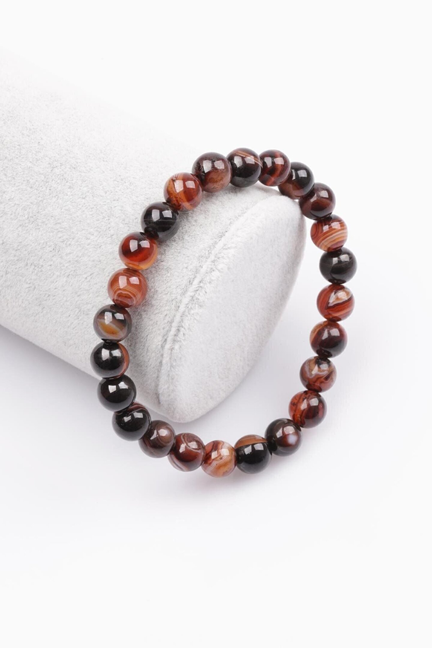 Doğal akik taşı kullanılarak üretilen bu bileklik, doğanın güzelliğini parmaklarınıza taşır.; Kahverengi çizgili deseniyle dikkat çeken tasarım, şık ve zarif bir görünüm sunar.; Nazar taşı olarak bilinen akik taşı, olumsuz enerjilere karşı koruyucu olduğu inancıyla bilinir ve genç yaş grubuna hitap eder.; 8 mm boyutundaki doğal taş boncuklar, bileğe zarif bir dokunuş katar ve bileğinize mükemmel uyum sağlar.; Bijuteri sınıfında yer alan bu bileklik, günlük kullanım için idealdir ve farklı kıyafetlerinizle kolayca kombinlenebilir.;