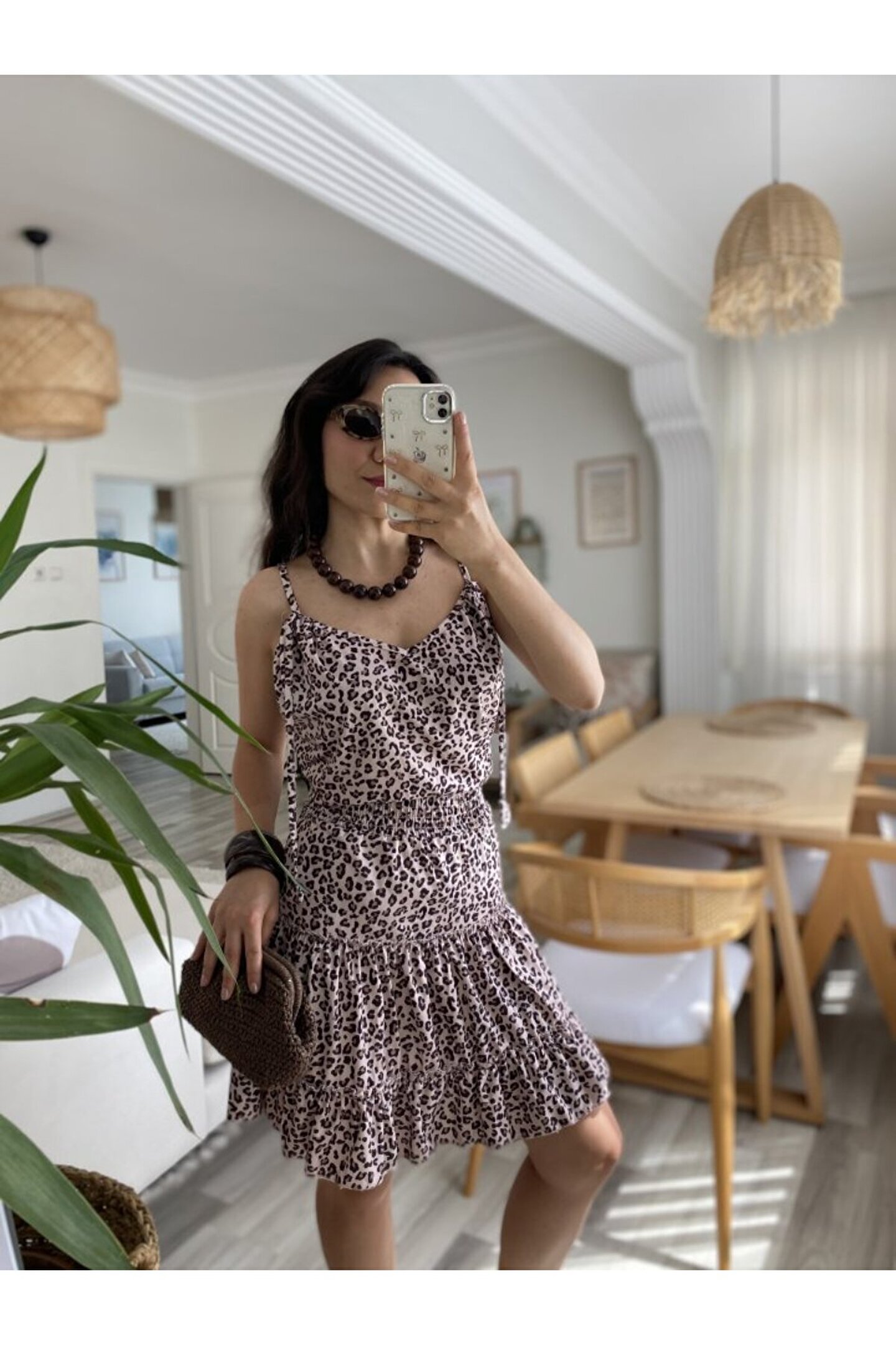 ARONA EQURİ Kadın Askılı V Yaka Beli Pileli Leopar Desen Eteği Fırfırlı Süprem Elbise