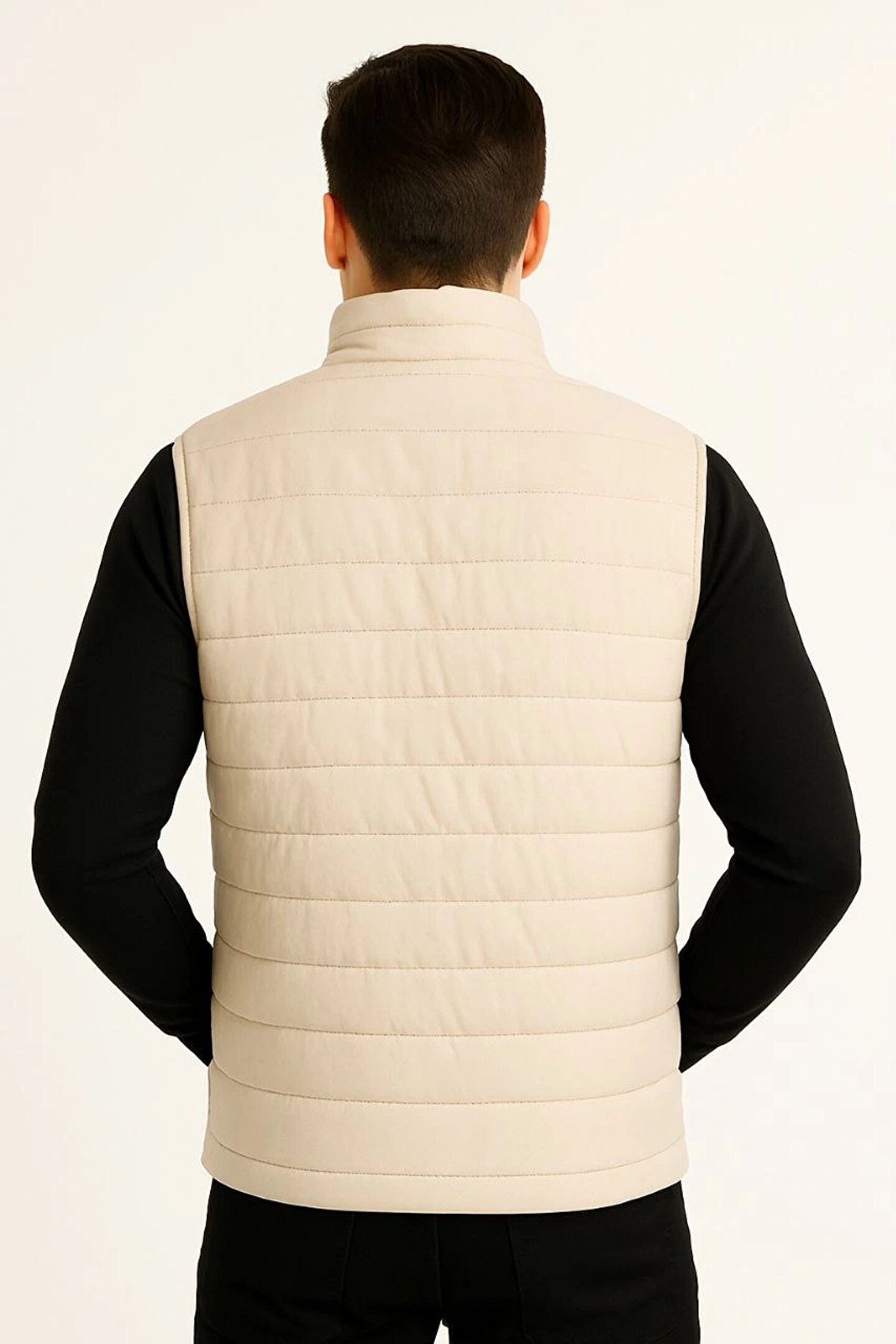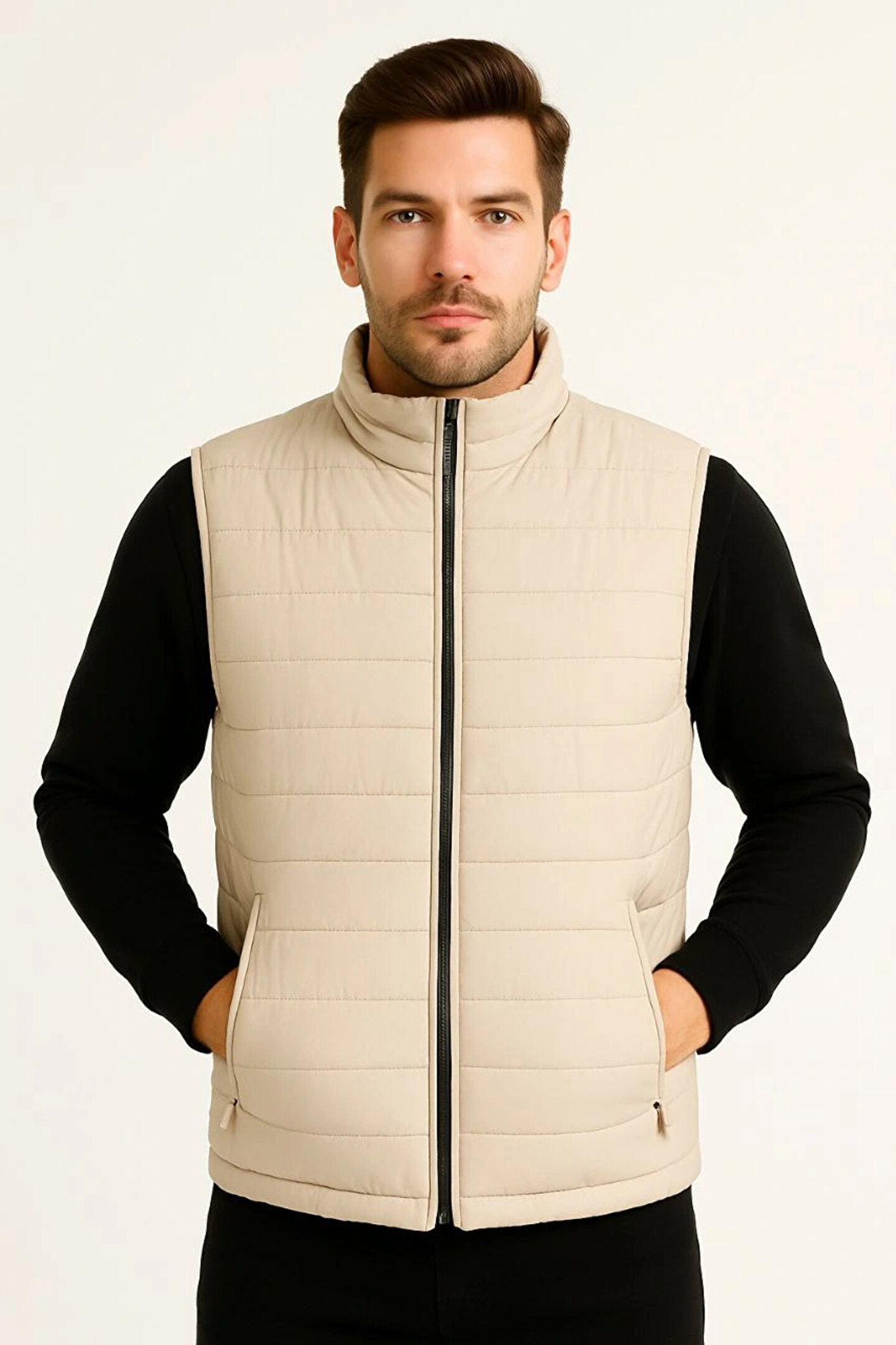 Erkek Şişme Fermuarlı Yelek Su itici Kapitone Astarlı Kumaş Cepli Hafif Kışlık Spor Rahat Kalıp -Bej