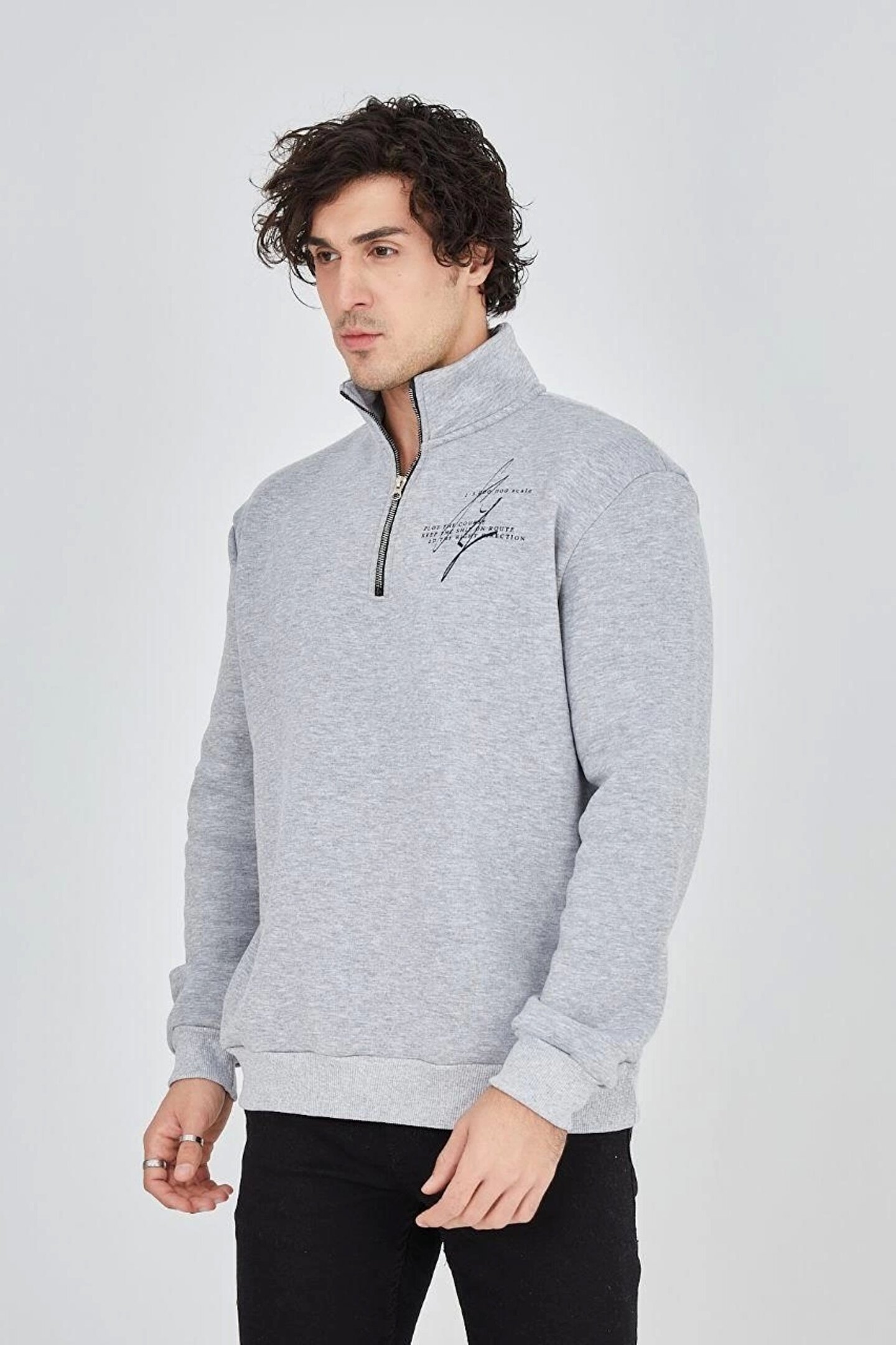 ARONA Erkek Yarım Fermuarlı Baskılı Sweat - Gri