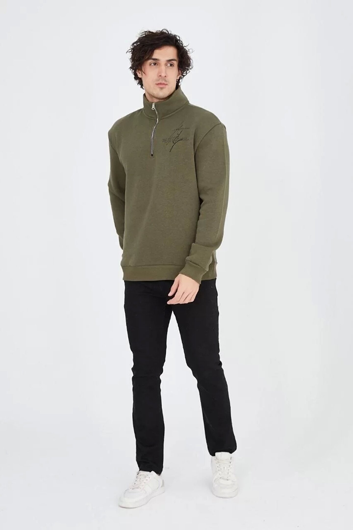 Erkek Yarım Fermuarlı Baskılı Sweat - Yeşil