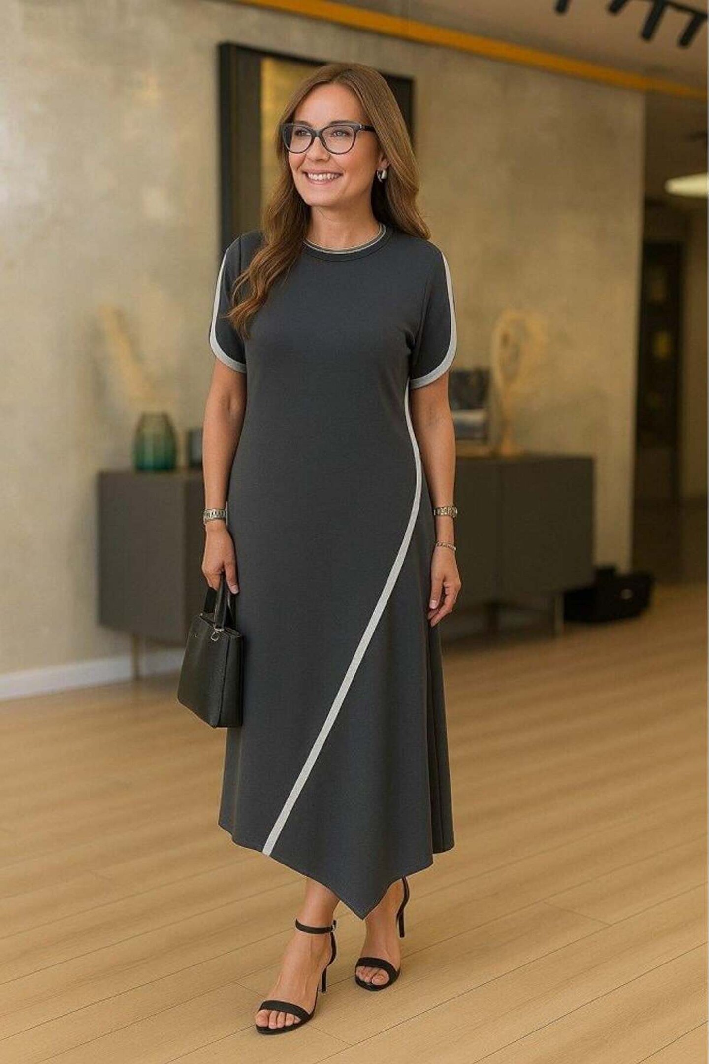 ARONA Kadın Kısa Kollu Bisiklet Yaka çift şerit Renk Detaylı Asimetrik Kesim Viskon Iki Iplik Elbise