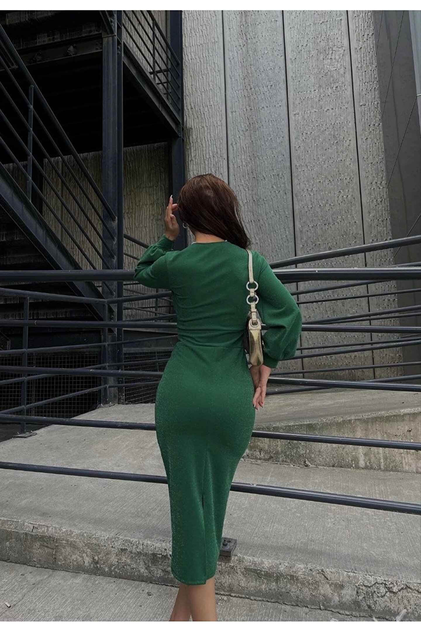 Kadın Kruvaze Yaka Balon Kol Simli Krep Kumaş Midi Boy Elbise