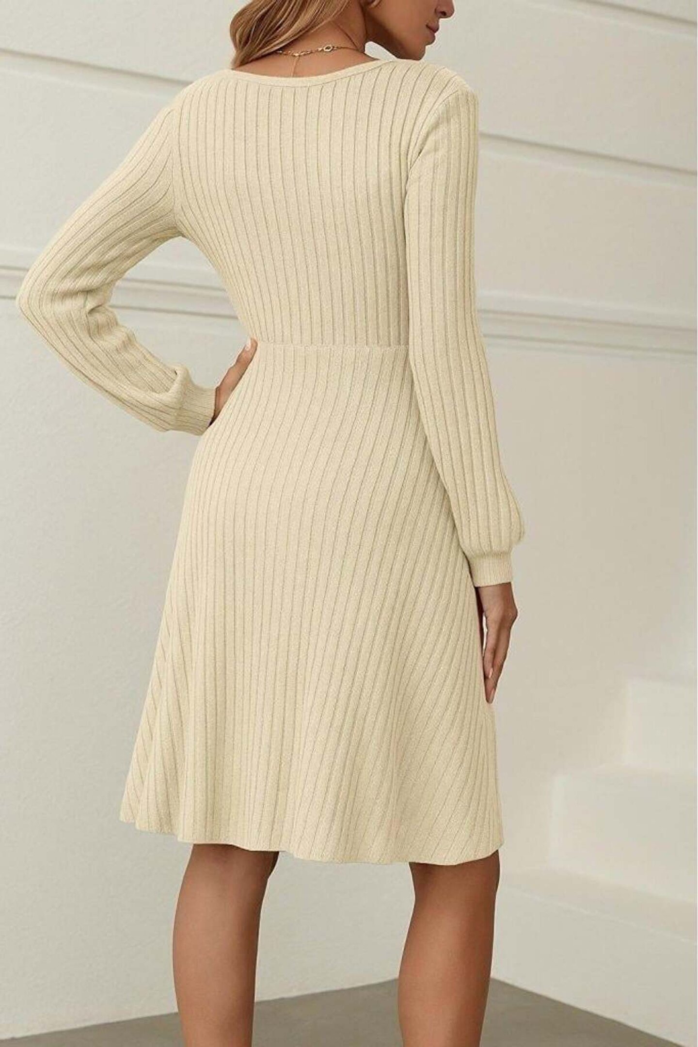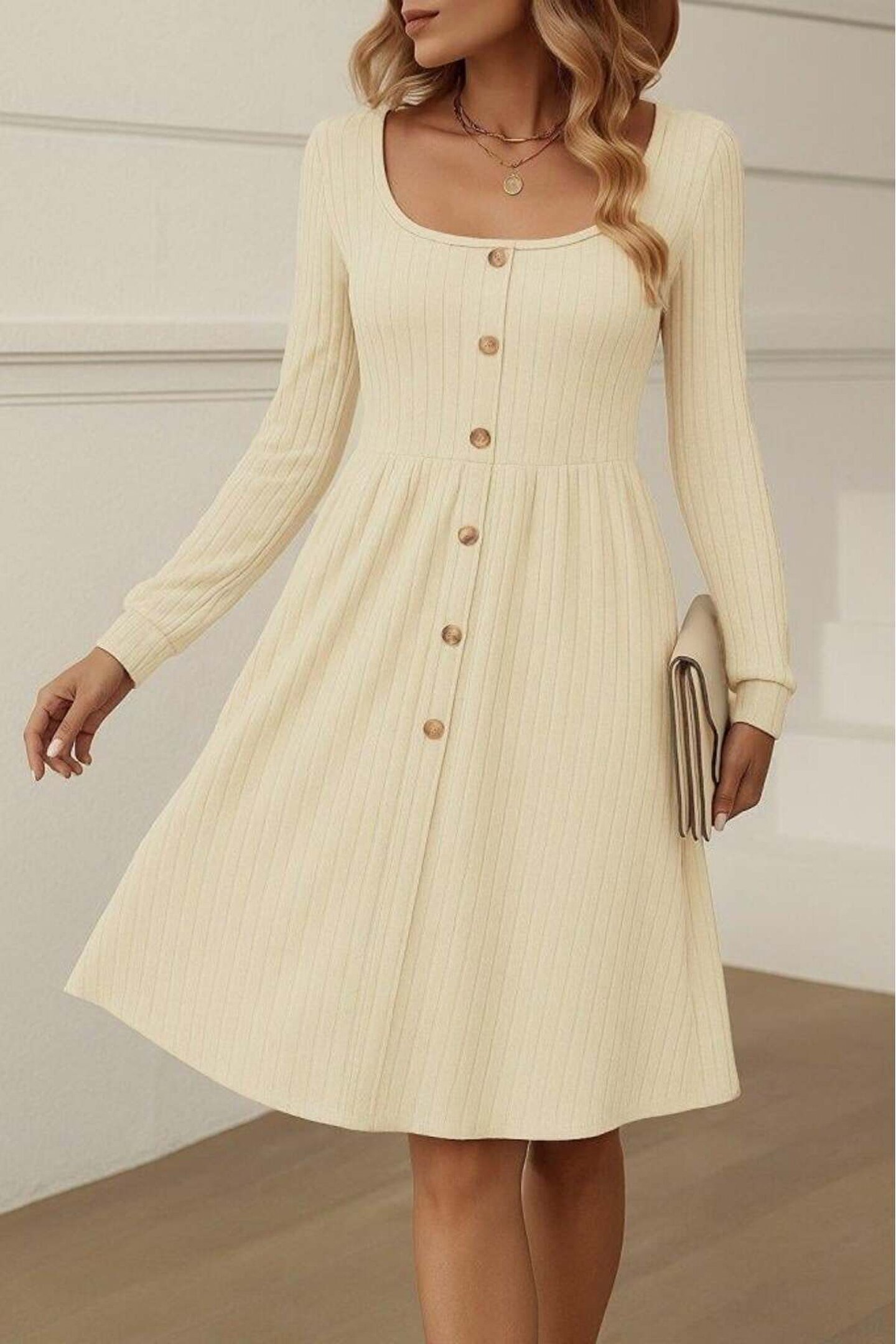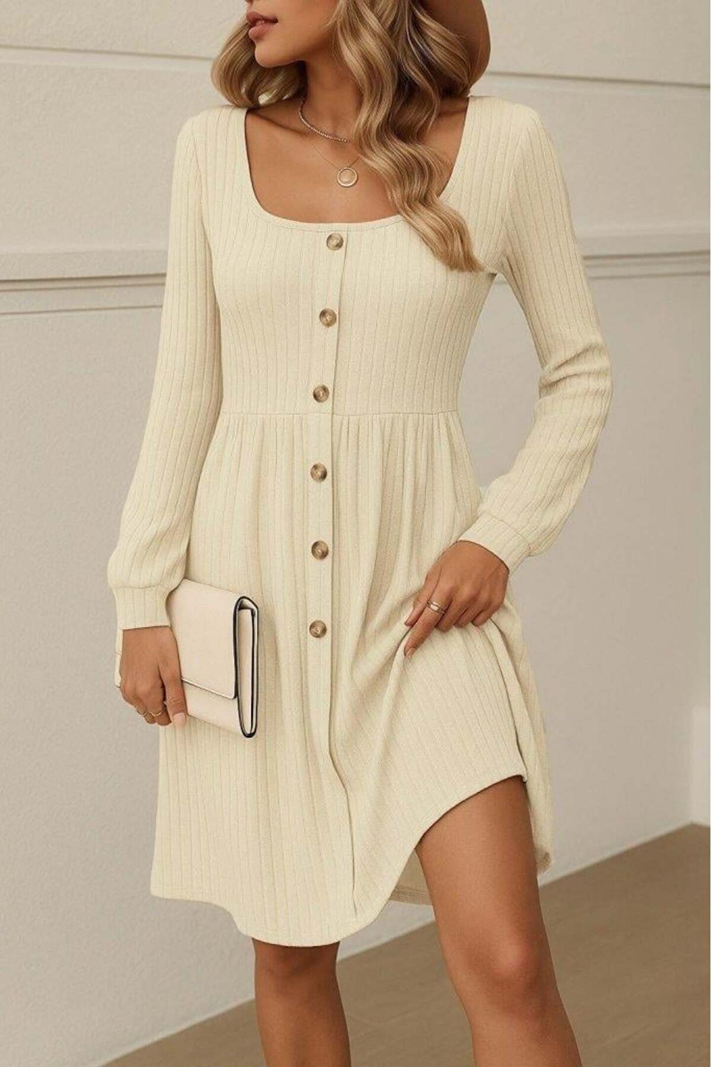 ARONA Kadın Uzun Kollu Kare Yaka Düğmeli Kısa şardonlu Iki Iplik Mini Elbise