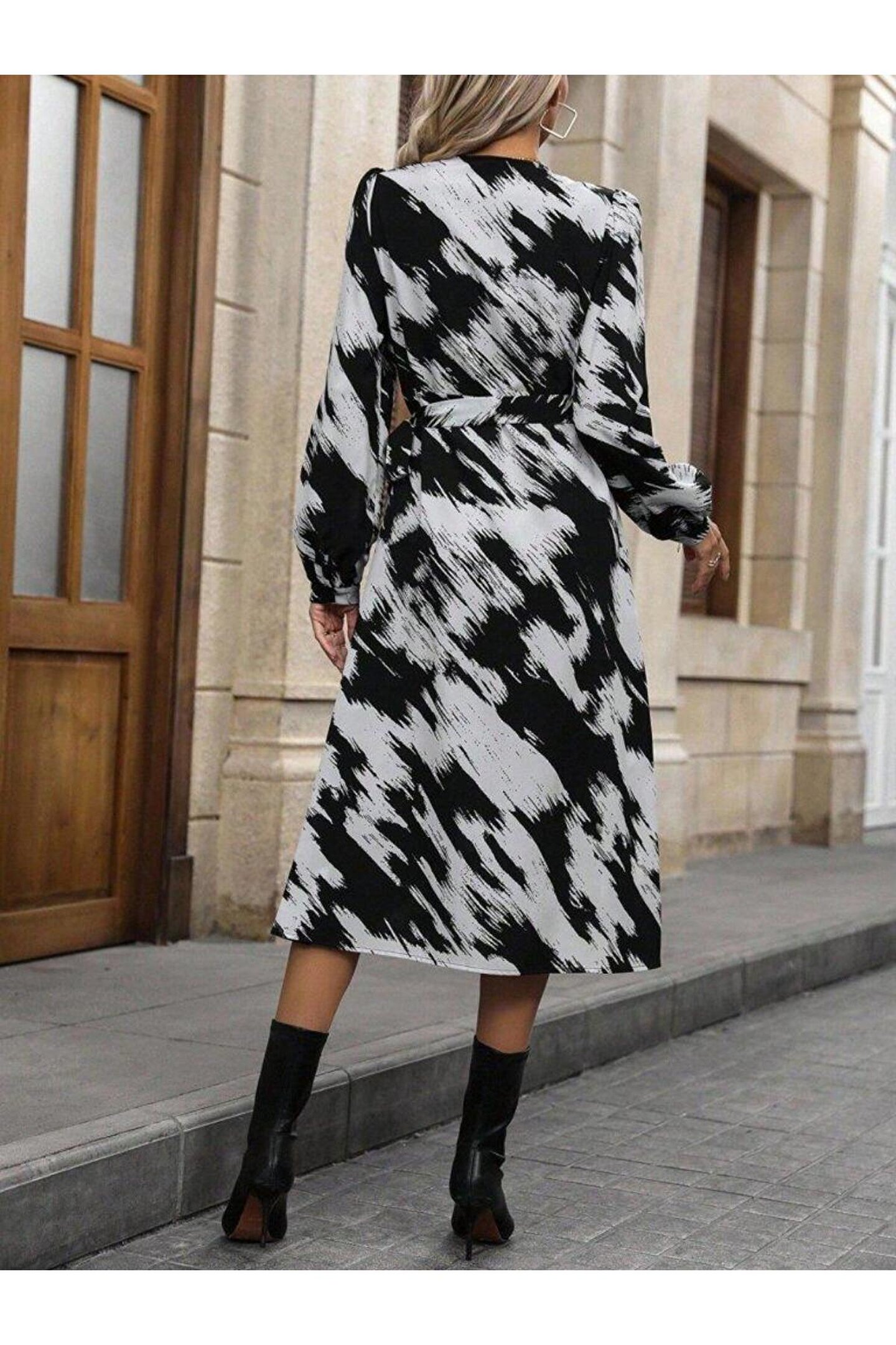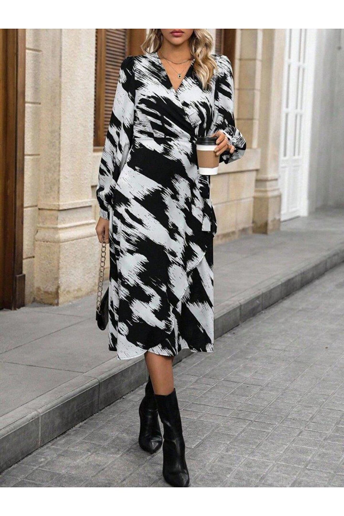 ARONA Kadın Uzun Kollu Kruvaze Yakalı Yandan Bağlamalı Desenli Mini Modal Elbise