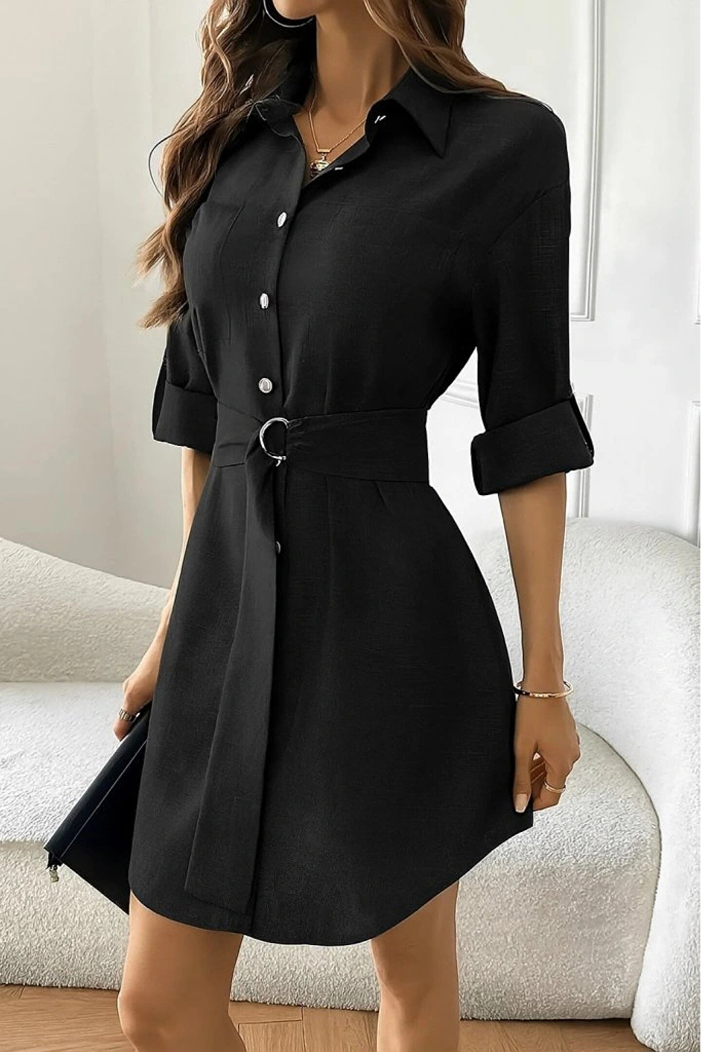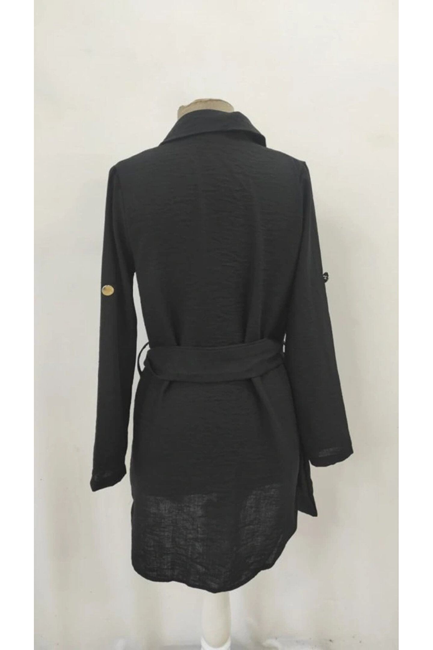 Kadın Uzun Kollu Yakalı önden Düğmeli Beli Kuşaklı Mini Ithal Keten Elbise