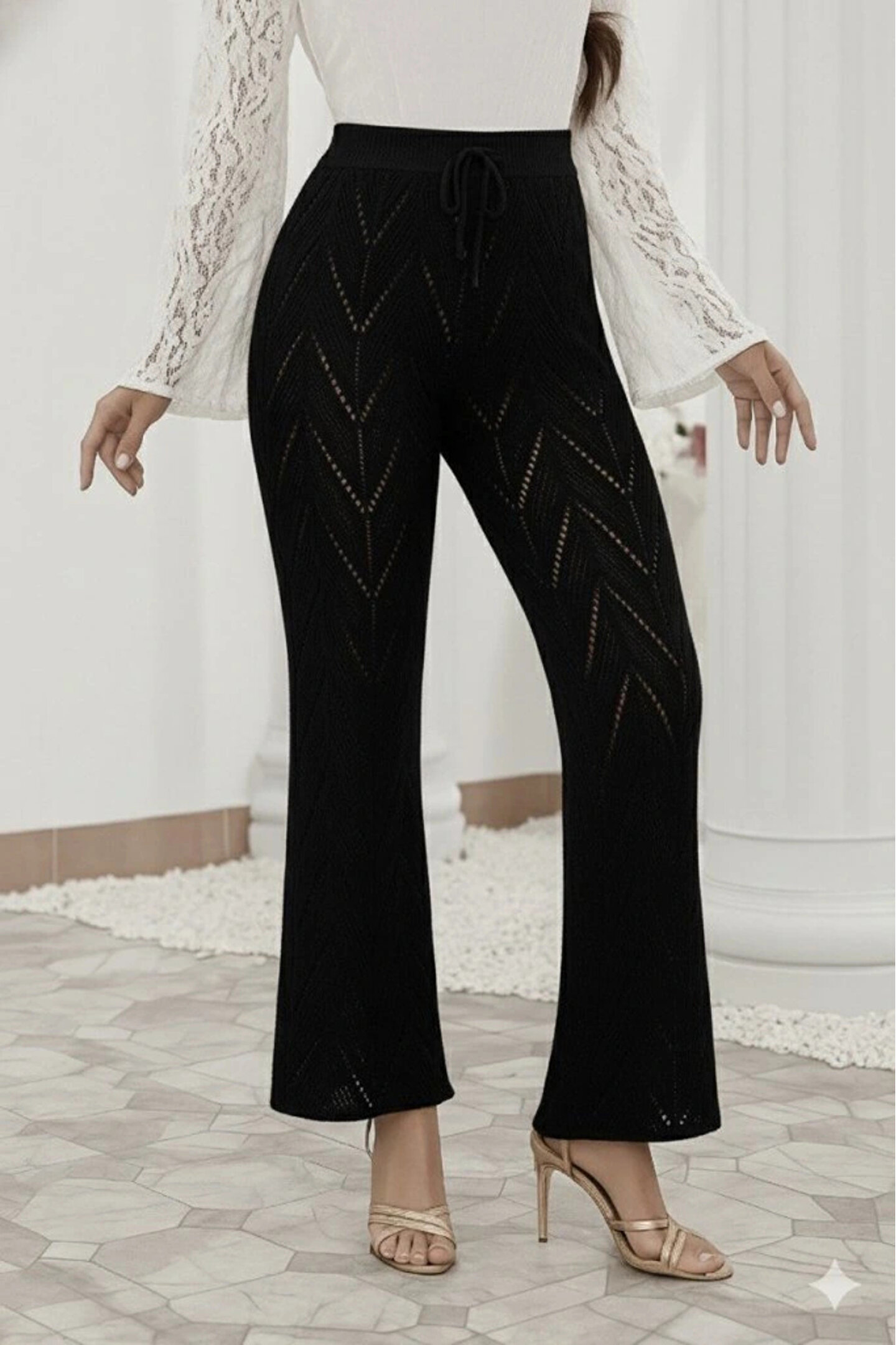 Kadın Yüksek Bel Bağcıklı Desenli Trikopantolon