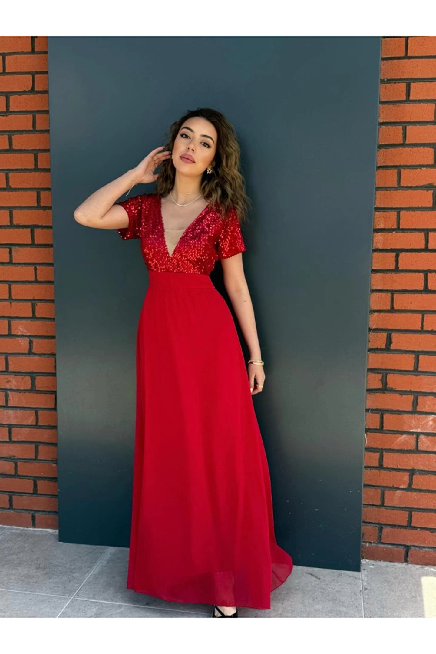 MDB Kadın Kısa Kollu Derin V Yakalı A Kesim Pulpayet Detaylı şifon Nedime Elbisesi