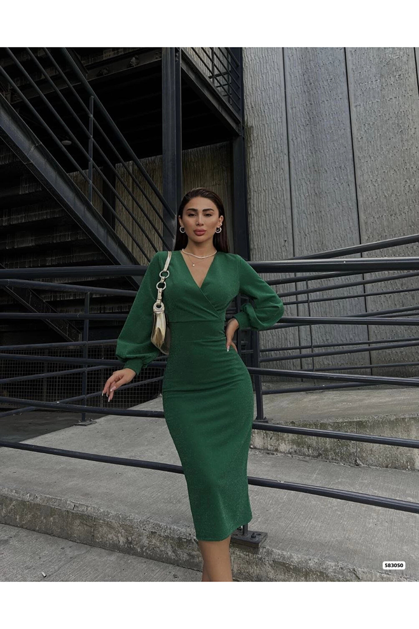 Kadın Kruvaze Yaka Balon Kol Simli Krep Kumaş Midi Boy Elbise