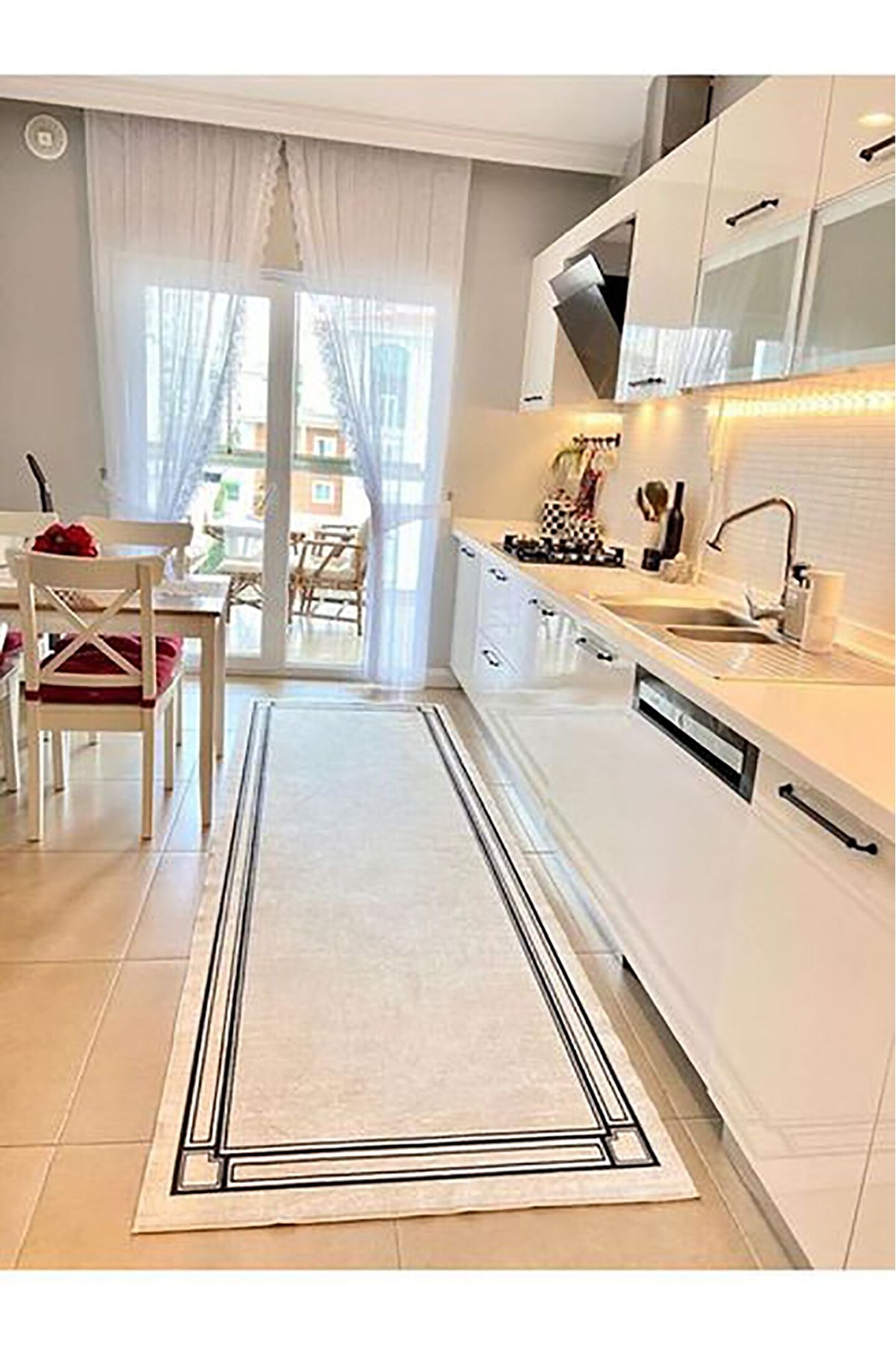 Dijital Baskı Yıkanabilir Kaymaz Taban Beyaz Zemin Çerçeveli Mutfak Halısı
