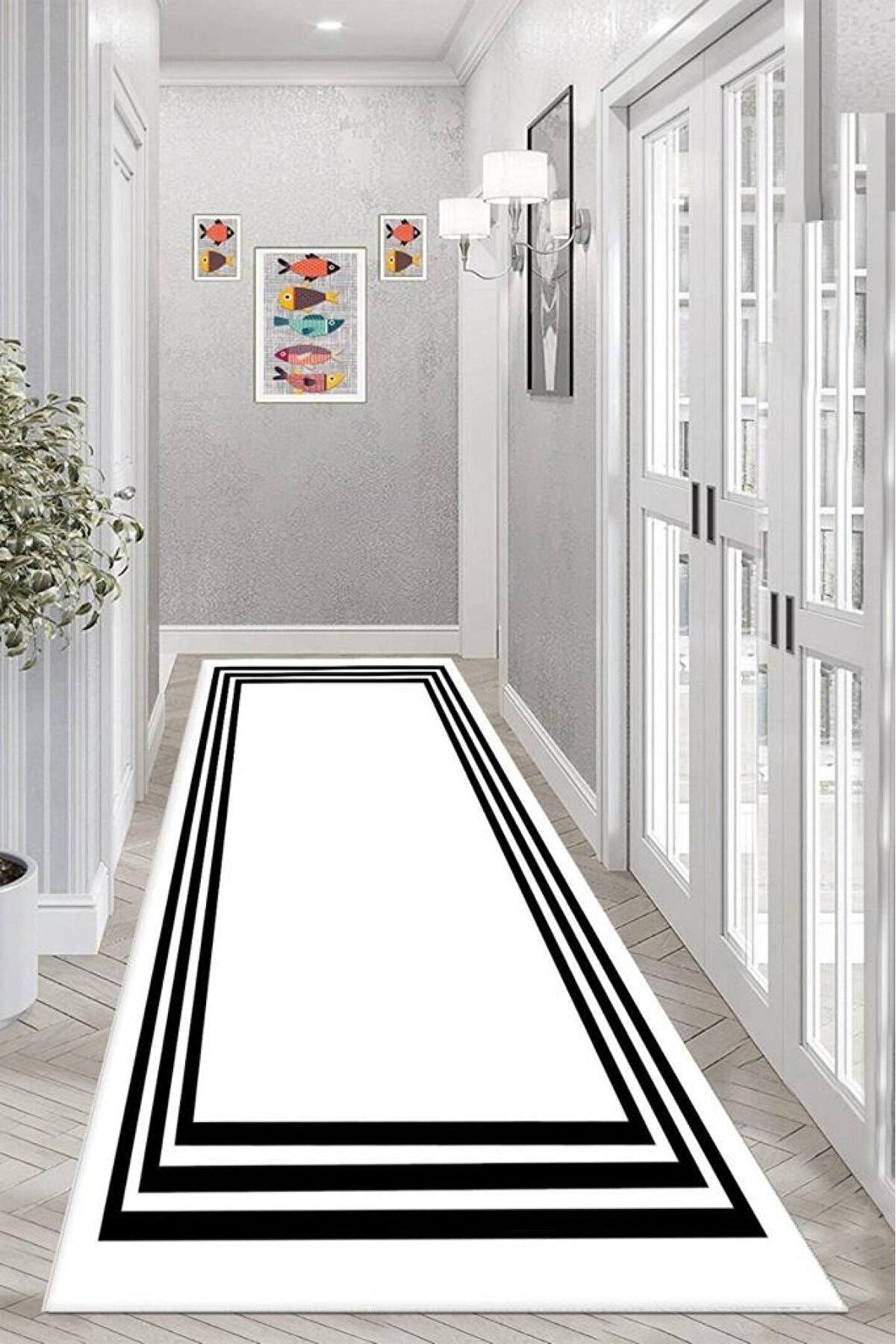 Dijital Baskı Yıkanabilir Kaymaz Taban Beyaz Zemin Üç Çizgili Yolluk Halı
