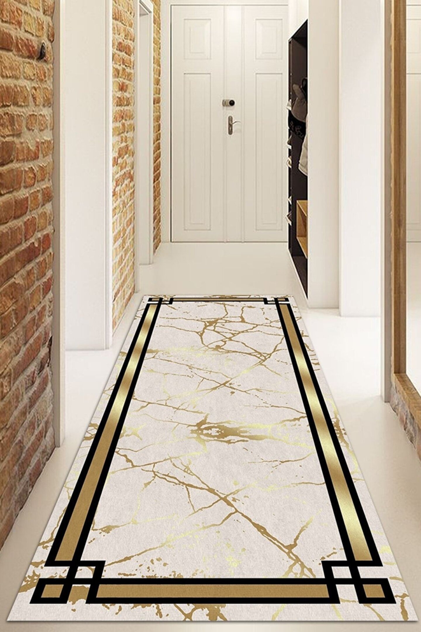 Dijital Baskı Yıkanabilir Kaymaz Taban Gold Çerçeveli Dekoratif Kare Yolluk Halı