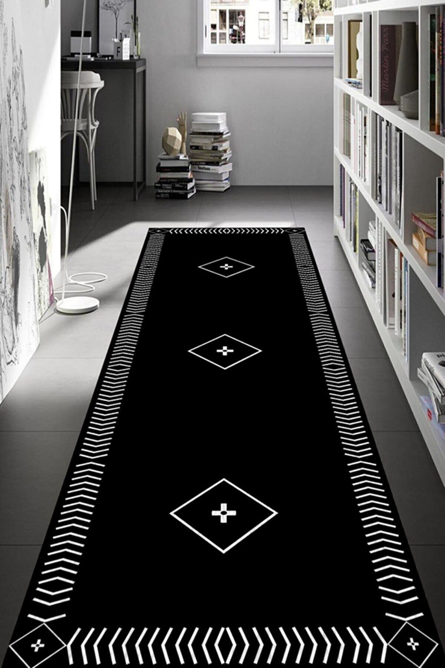 Dijital Baskı Yıkanabilir Kaymaz Taban Siyah Iskandinav Desenli Yıkanabilir Yolluk Halı