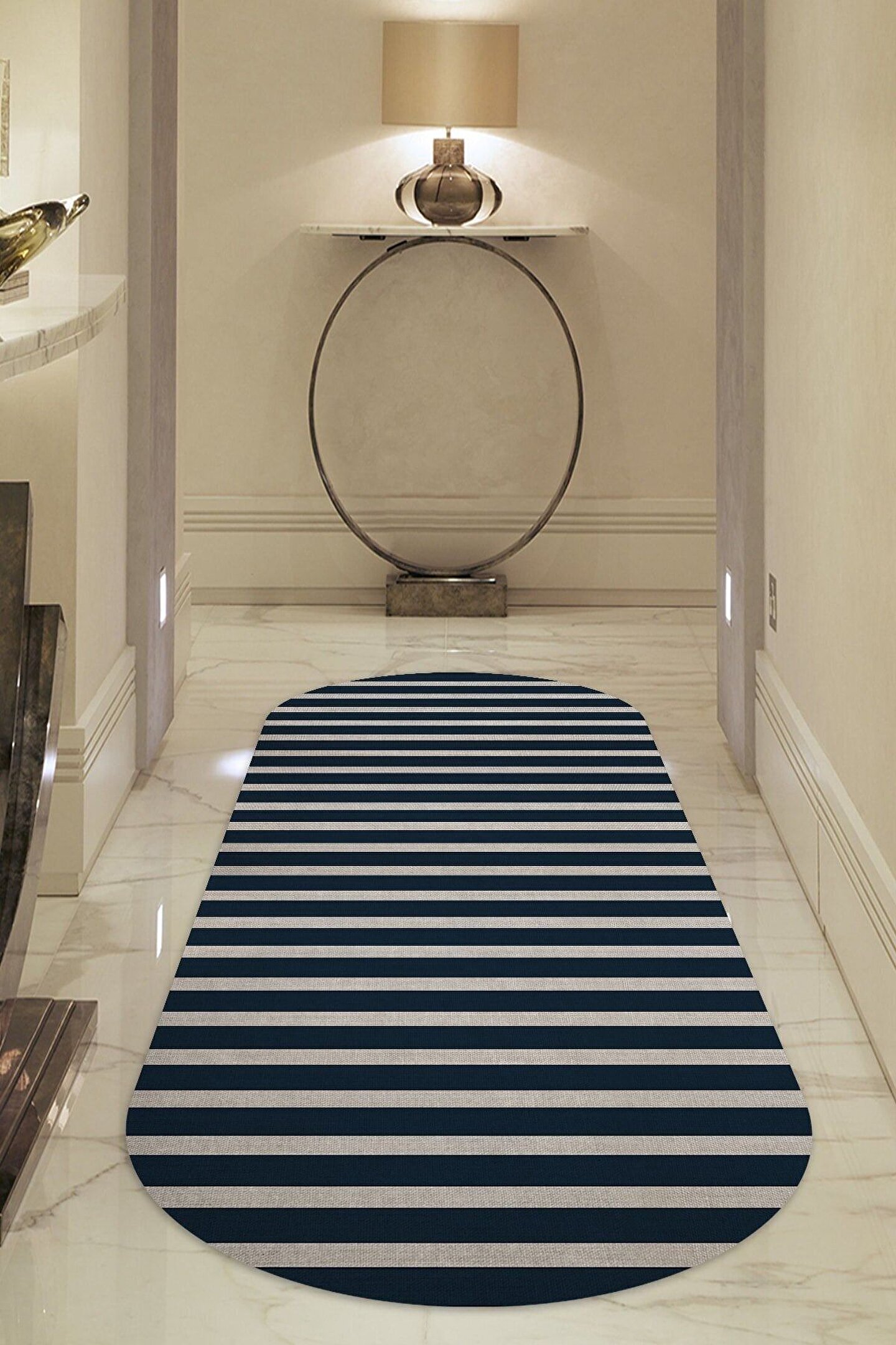 Dijital Baskı Yıkanabilir Kaymaz Taban Yatay Lacivert Çizgili Oval Salon Halısı Ve Kilim Yolluk Halı