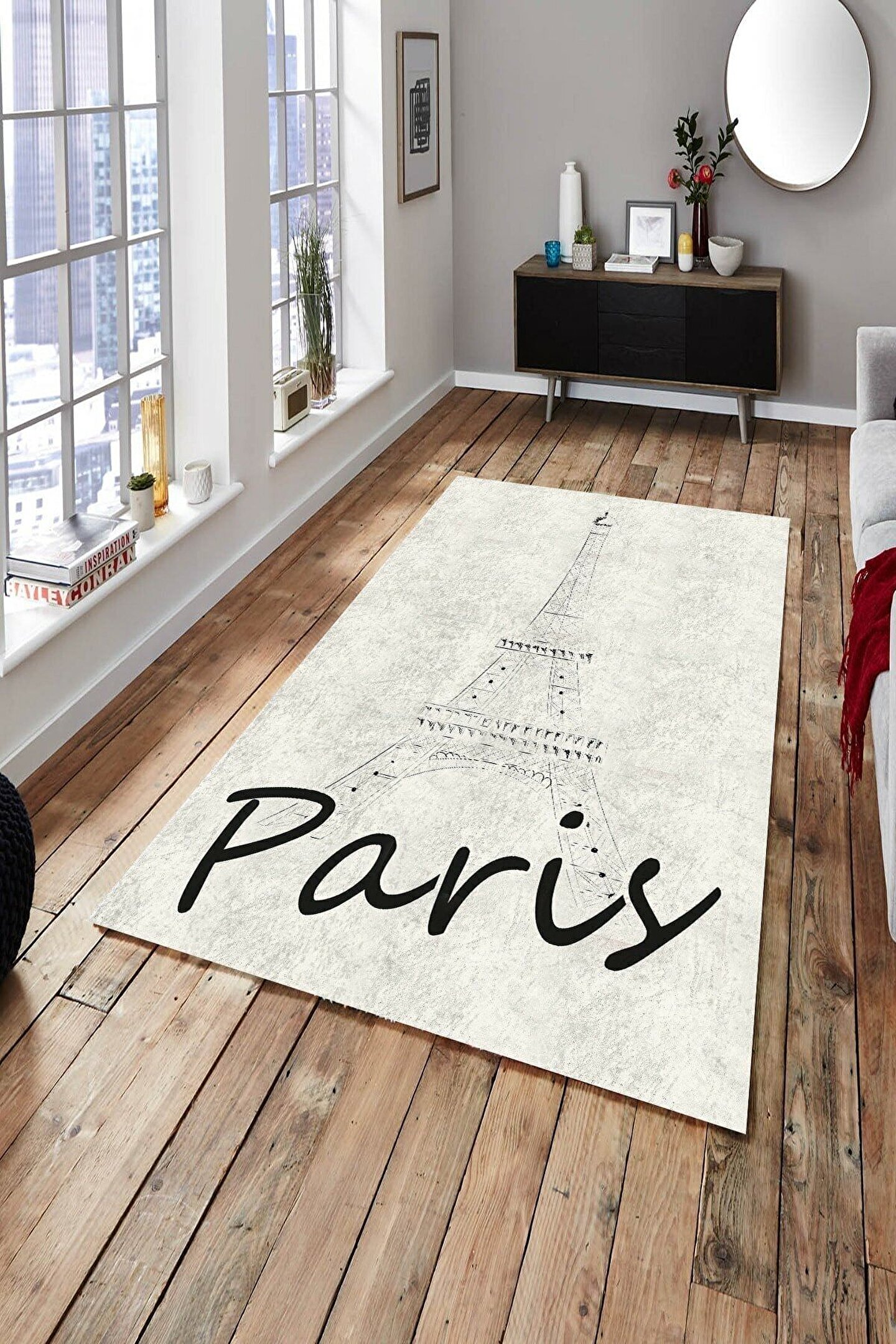 Krem Zeminli Eyfel Kulesi Desenli Paris Yazılı Halı