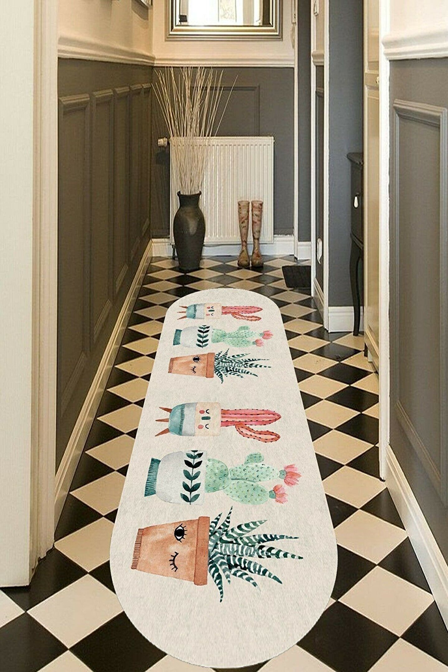 Sevimli Kaktüs Desenli Oval Krem Halı