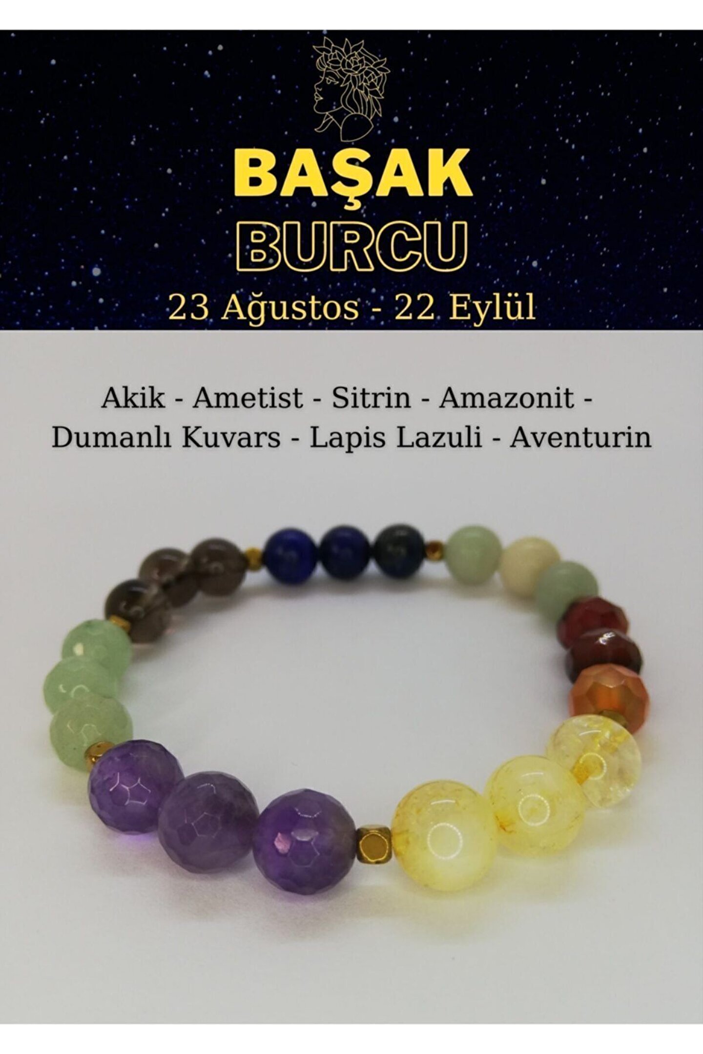 *Ürünümüz Orijinal Doğal Taşlardan Hazırlanmıştır.; Unisex Modeldir.; Bileklik Başak Burcunun en önemli 7 taşından oluşmaktadır.; Bunlar Ametist, Akik, Aventurin, Lapis Lazuli, Dumanlı Kuvars, Sitrin, Amazonit Taşların boyutu 8mm.; dir.; Ara aparatları nikel kaplamadır.; Elastik misina kullanılmıştır.; Paketlemede, ürünümüzün yanına yedek taşları ve elastik misinası ile gönderilmektedir; *Taşlarınızın Arındırılması İçin; haftada bir kez akan suda 5dk.; suda bekleterek, tütsüleyerek veya bir gece toprak üstünde bekleterek enerjilerini dengeleyip temizleyebilirsiniz.