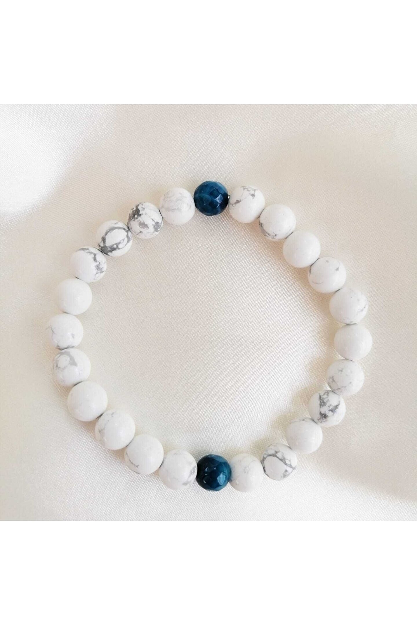 Havlit - Mavi Akik Doğal Taş Bilekliğimiz 8 mm küre kesim havlit taşı ile 8 mm faset kesim mavi akik taşlarından oluşmaktadır. ; Havlit Taşı Faydaları Sanatsal duyarlılığı ve ifadeyi kuvvetlendirir. ; Huzur ve sakinlik verir. ; Bencilliği yok eder. ; Strese karşı iyi gelir. ; Kalsiyum dengesini sağlar. ; Dişler ve kemikler üzerinde olumlu etkileri vardır. ; Kişinin kendiyle barışık olmasını sağlar. ; Engellerin aşılmasına yardımcı olur. ; Öfkeyi ve kızgınlığı engeller. ; Hafızayı güçlendirir. ; Kanı toksinlerden arındırır. ; Kan hastalıklarında faydalıdır. ; Uykusuzluk problemlerine iyi gelir. ; Hormonal sistemi düzenler. ; Eklemleri güçlendirir, sağlıklı tutar., Kırık yada çıkık kemiklerde kolay iyileşme sağlar. ; Akik Taşı Faydaları Sünnet olan ana taştır. ; Nazara karşı en iyi taşlardan birisidir. ; Vücuttaki fazla veya olumsuz enerjiyi atmaya yarar ve böylece stresi yok eder, sakinleştirir. ; Korkuların yenilmesinde, cesaretin artırılmasında kullanılır. ; Akıl ve mantık gücünü geliştirir. ; Yaratıcılığı arttırır. ; Dikkati toplamaya ve mantıklı hareket etmeye yardımcı olur. ; Bedeni fiziken güçlendirir. ; Enerji yenilenmesi sağlar. ; Fiziksel enerjiyi dengeli olarak artırır. ; Kötü rüyalardan korunmak için kullanılır.;