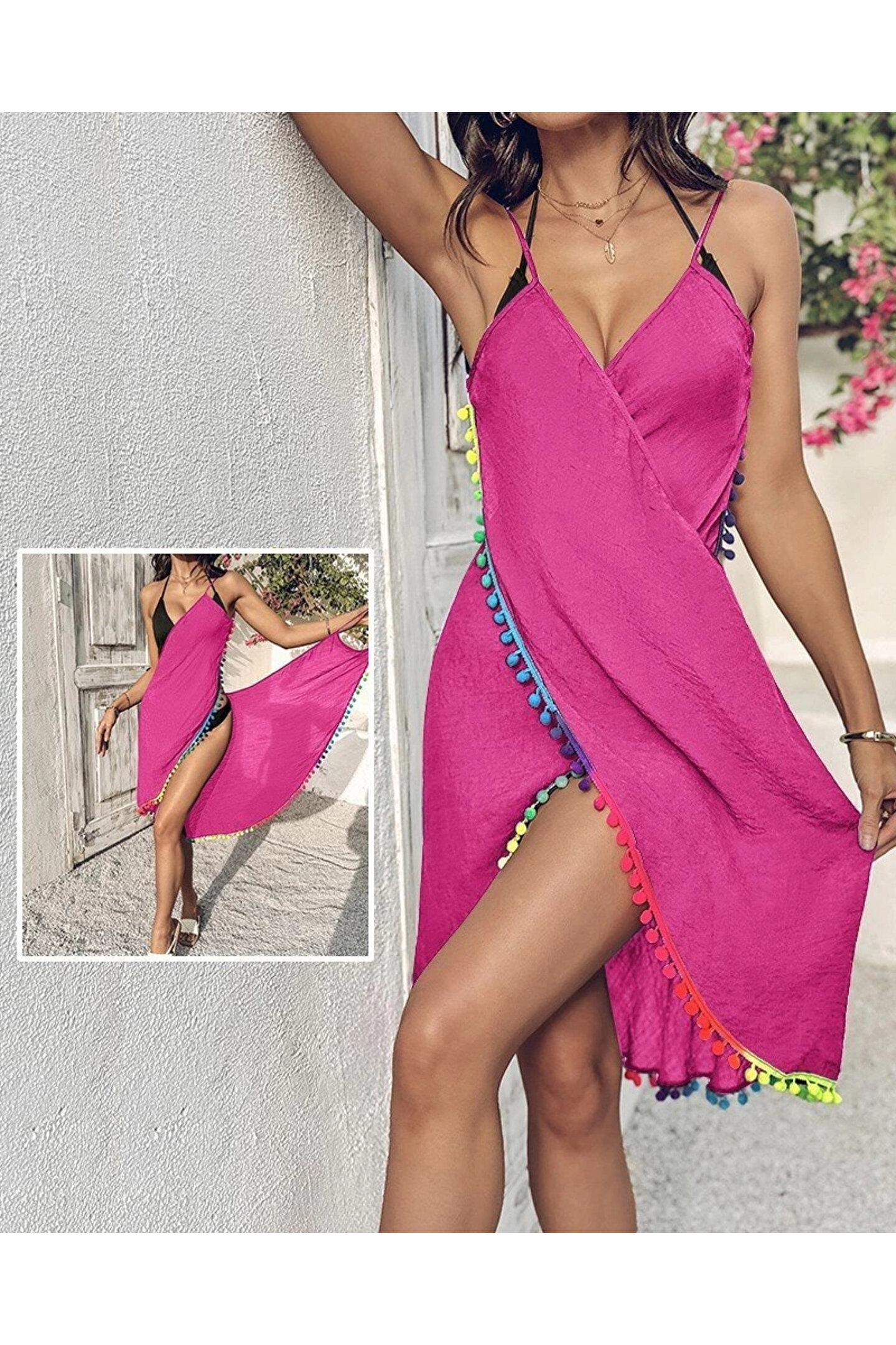 aruz moda giyim & ayakkabı Kadın Askılı Derin V Yakalı çapraz Geçmeli Ponponlu Bürümcük Pareo