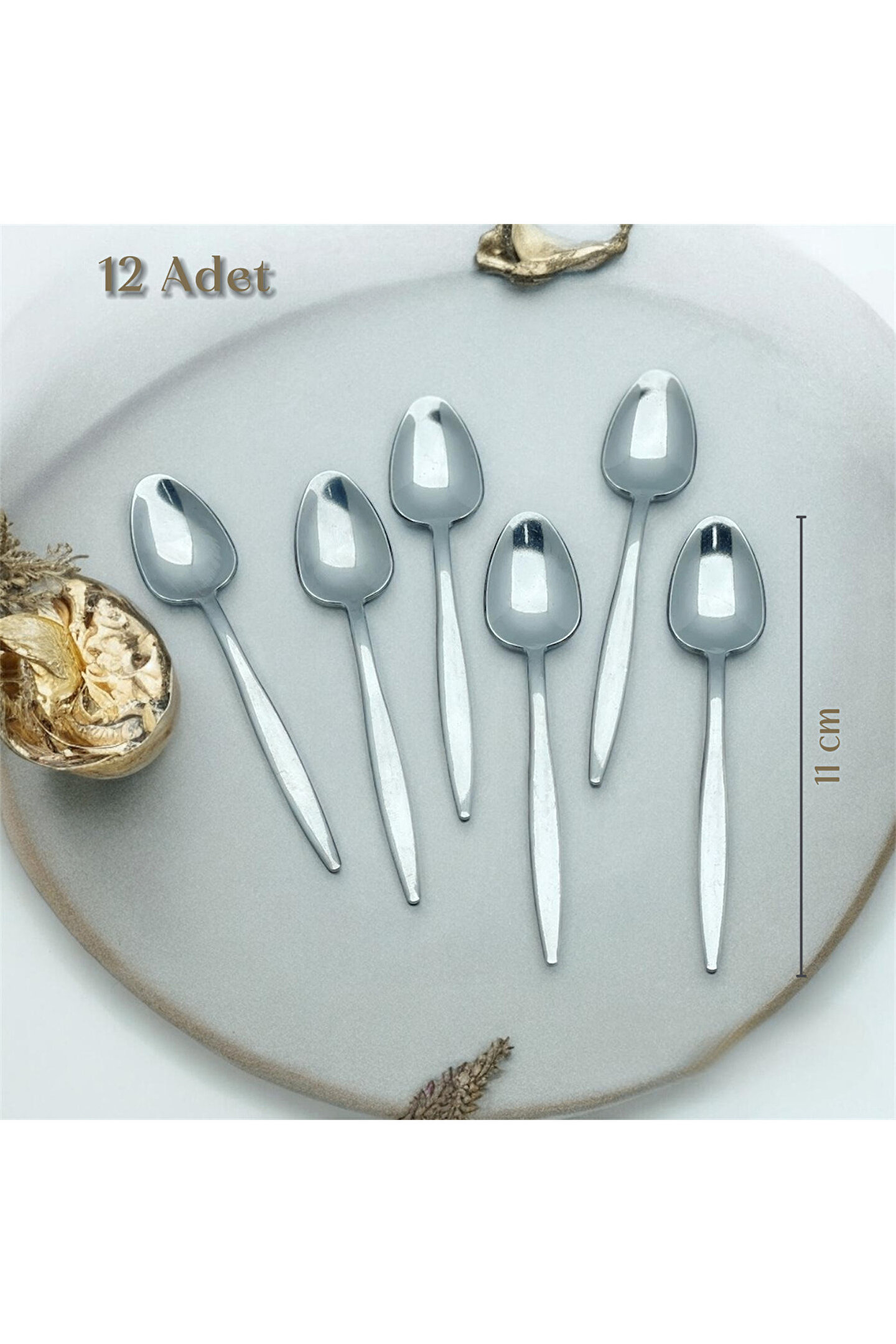 - Paslanmaz çelik malzemesi sayesinde uzun ömürlü kullanım ve dayanıklılık sunar; - 12 kişilik set içeriği ile aile yemeklerinden özel davetlere kadar her türlü toplantıda ihtiyacınız olan çay kaşıklarını tek seferde temin edebilirsiniz; - Sivri model tasarımı, çay ve kahve gibi sıvı içeceklerinizi rahatça karıştırmak için idealdir;